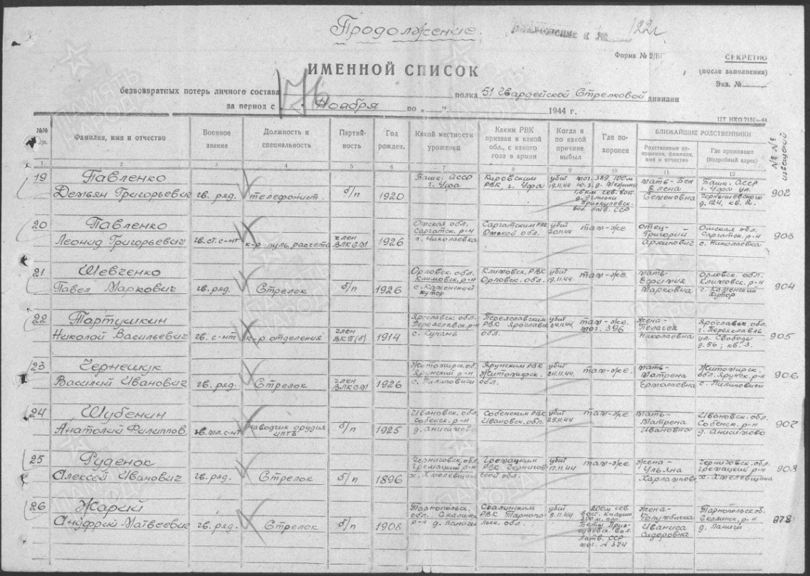 Последнее место службы Павленко Д.Г.: 156 гв. сп 51 гв. сд Прибалтийского фронта.
