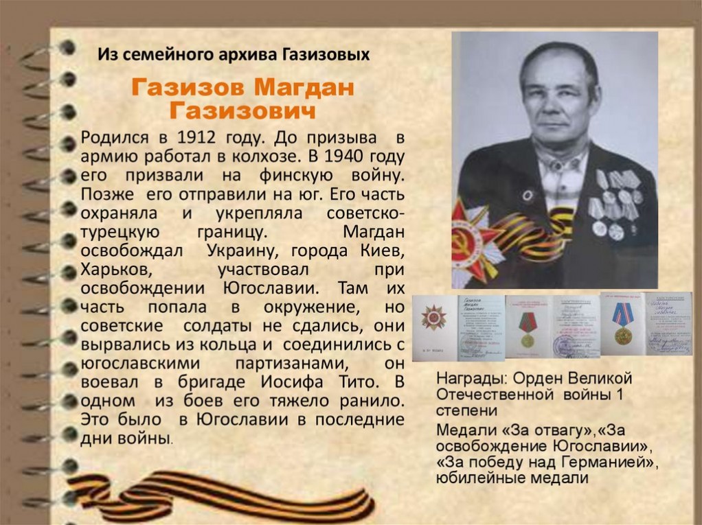 Миникаевой Анфисой Халяфовной представлены фотографии партизана и его документов из семейного архива Газизовых и из фондов Историко-краеведческого музея МБОУ ООШ д.Саузбаш Краснокамского района.