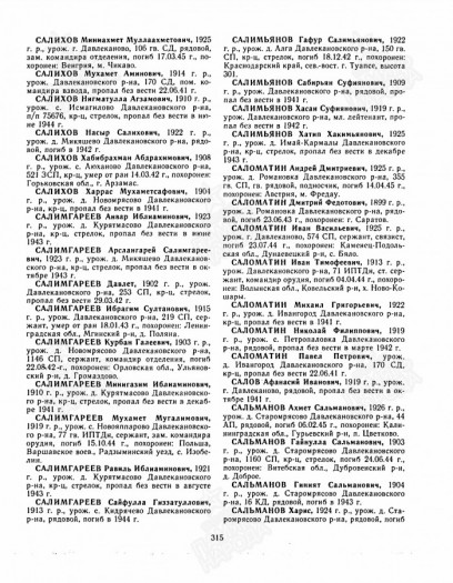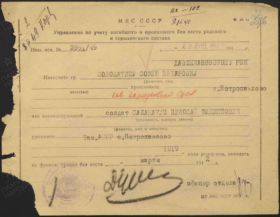 Дата выбытия из отряда __.03.1942 г. Причина выбытия: погиб, пропал без вести, где и когда не известно. Похоронка была направлена отцу Саламатину Филлипу в д.Петропавловка Башкирской АССР 01.02.1945 года.
