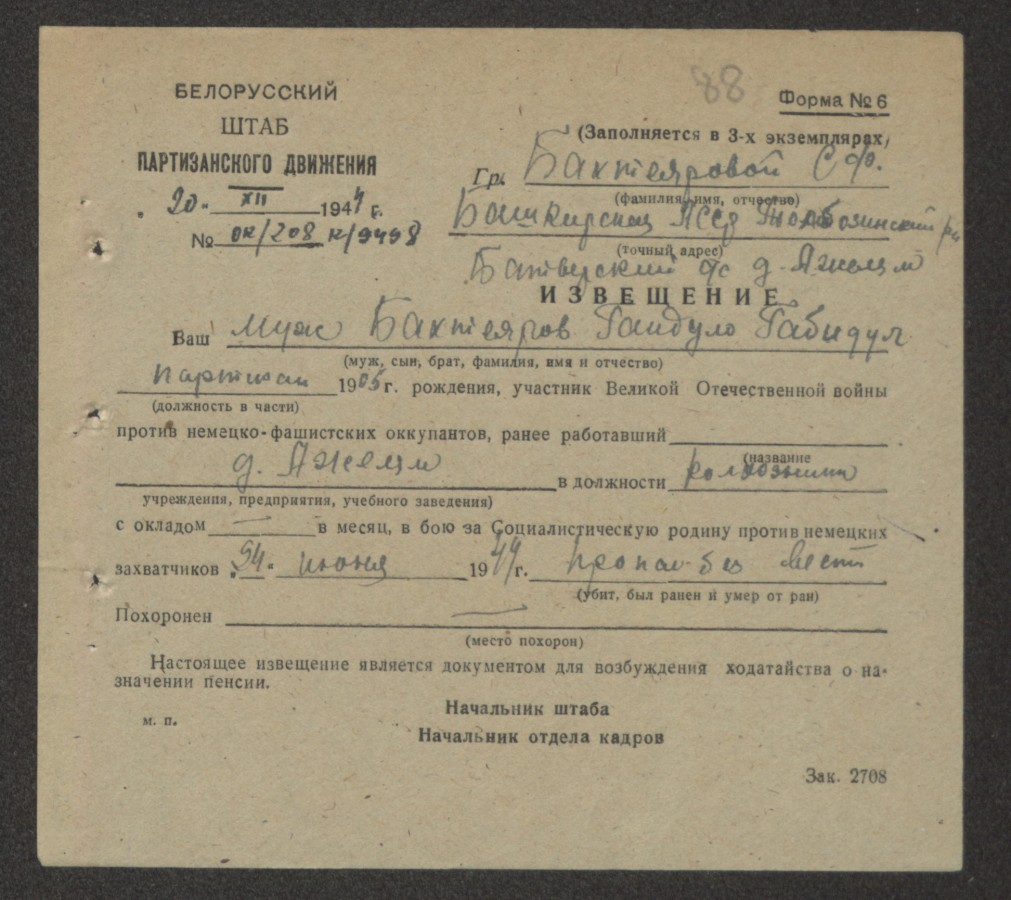 Год рождения — 1918 г.р.; место рождения — г.Ишимбай (Ишабаево); Партизанский отряд им. Жданова Велейской обл.