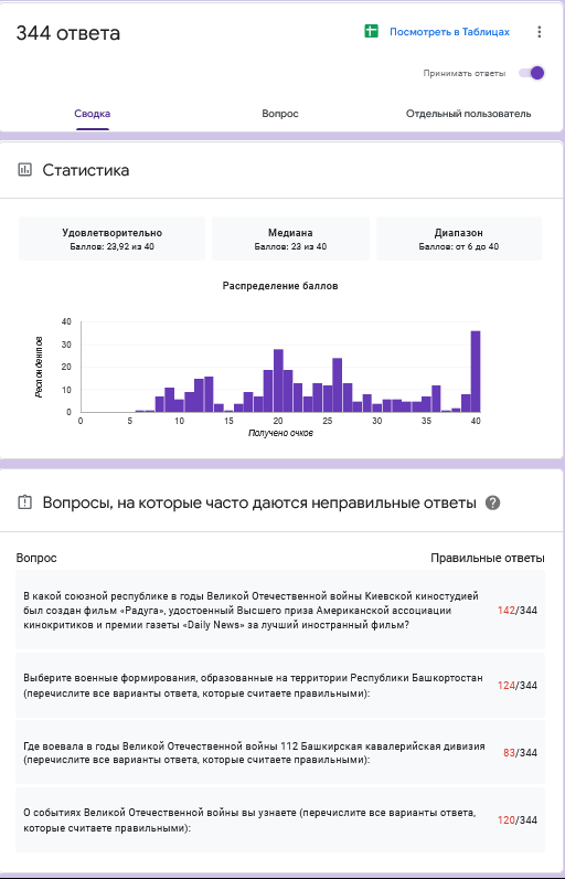 Слабые места знаний: Участники тестирования плохо знают историю участия союзных республик СССР в Великой Отечественной войне. Только 41 % участников верно ответили на вопросы, касающиеся национальных героев и участия в войне республик Советского Союза. Низкий уровень знаний показали участники о военных формированиях Башкортостана и местах сражений 112 Башкирской кавалерийской дивизии. Лишь 36% респондентов смогли правильно назвать военные формирования, созданные на территории Башкирии (76 и 112 кавалерийские дивизии, 1292 истребительный противотанковый артиллерийский полк, 219 стрелковая дивизия), только 24% участников знали, что прославленная 112-я Башкирская кавалерийская дивизия (16-й гвардейская Черниговская кавалерийская дивизия) воевала в Донецкой, Ворошиловградской, Курской и Ростовской областях. Источники информации о событиях войны ограничены. Большинство опрошенных получают знания о войне из школьных учебников (86,2%), интернета (73,7%) и фильмов (71,1%). Рассказы краеведов и ветеранов используются редко, что указывает на необходимость вовлечения ветеранов и краеведов в образовательный процесс.