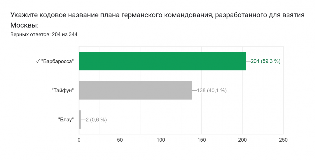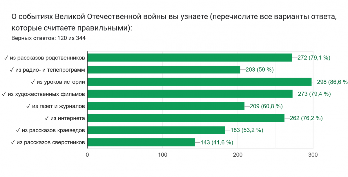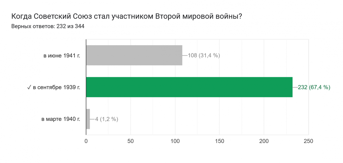 Участники тестирования осведомлены об основных памятных датах (даты начала и окончания Великой Отечественной и Второй мировой войн, День Неизвестного солдата). Хорошо усвоены ключевые события войны (Защита Брестской крепости, Сталинградская битва). Респонденты знают о подвигах героев (Николай Гастелло, Рихард Зорге).