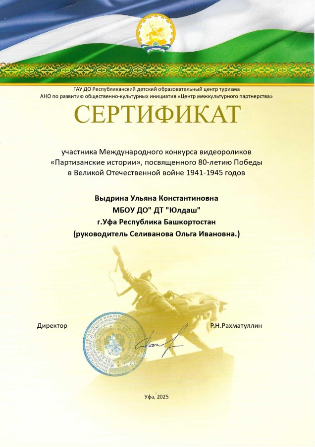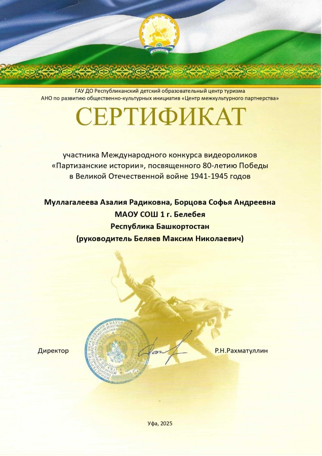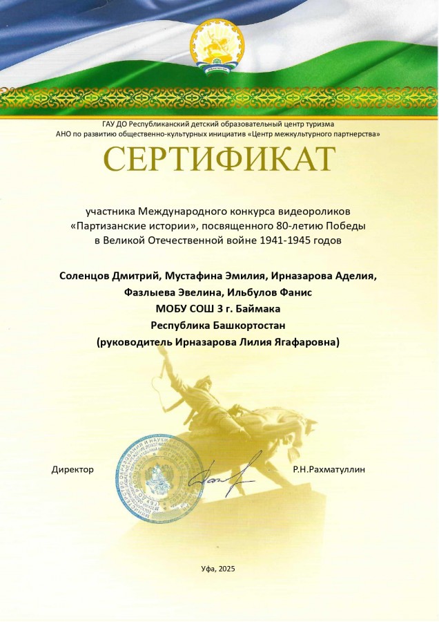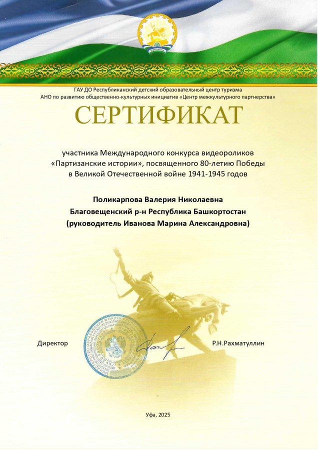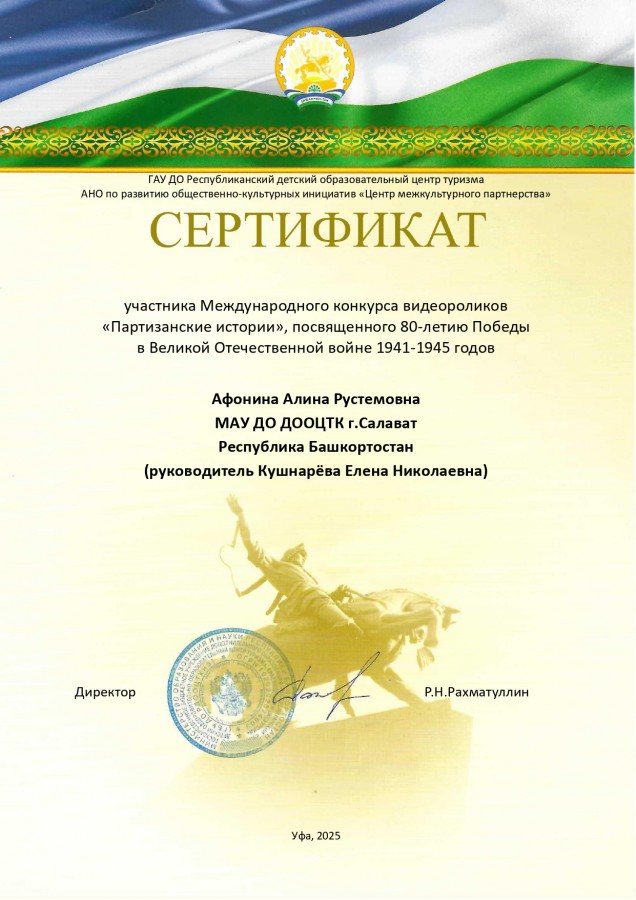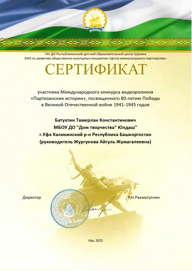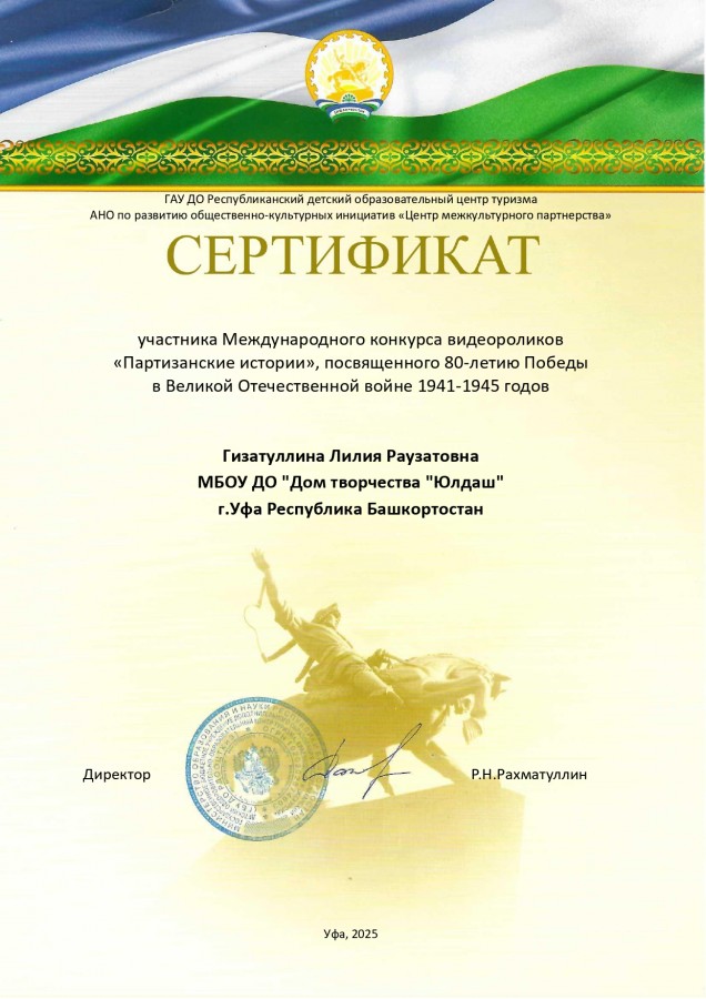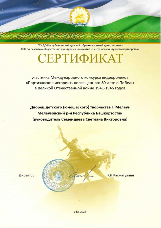 С 20 ноября 2024 года по 10 февраля 2025 года Республиканский детский образовательный центр туризма провёл Международный конкурс видеороликов «Партизанские истории», посвящённый 80-летию Победы в Великой Отечественной войне. Мероприятие прошло в рамках историко-просветительского проекта «Жители Башкирии в рядах партизан и подпольщиков в годы Великой Отечественной войны 1941–1945 гг.», разработанного АНО «Центр межкультурного партнёрства» при поддержке Фонда Главы Республики Башкортостан.