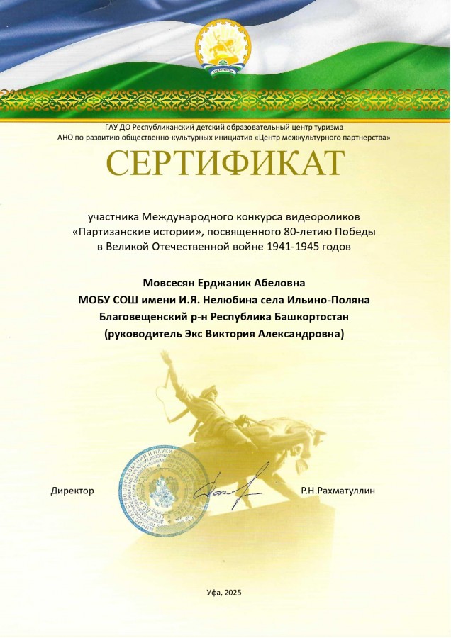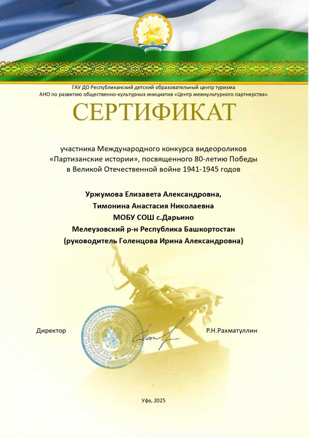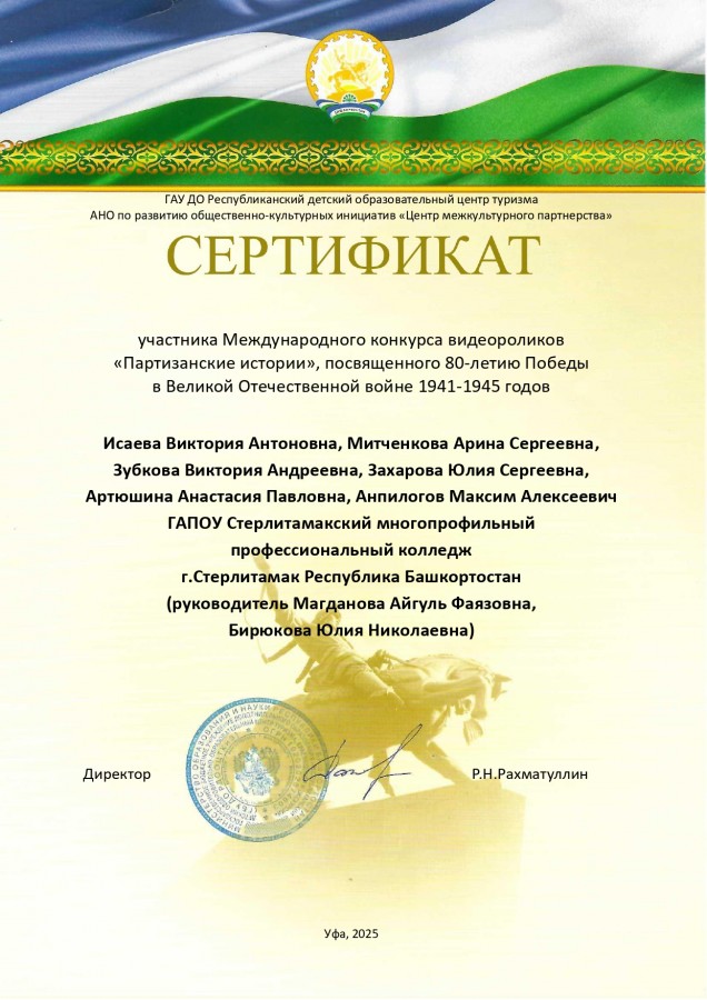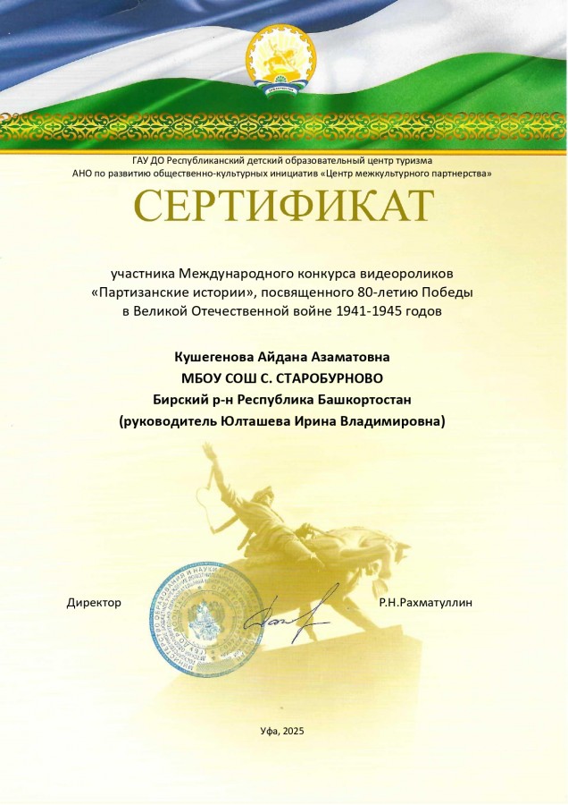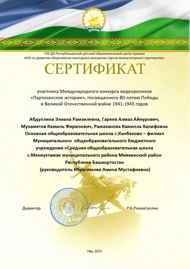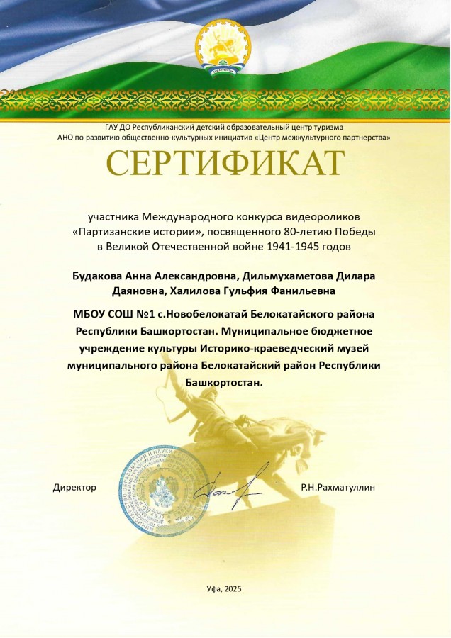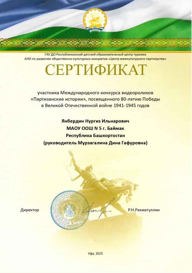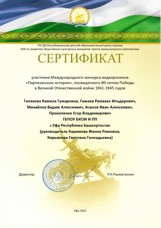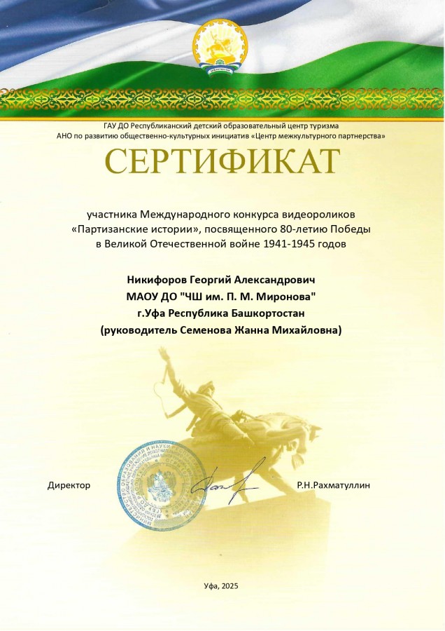 С 20 ноября 2024 года по 10 февраля 2025 года Республиканский детский образовательный центр туризма провёл Международный конкурс видеороликов «Партизанские истории», посвящённый 80-летию Победы в Великой Отечественной войне. Мероприятие прошло в рамках историко-просветительского проекта «Жители Башкирии в рядах партизан и подпольщиков в годы Великой Отечественной войны 1941–1945 гг.», разработанного АНО «Центр межкультурного партнёрства» при поддержке Фонда Главы Республики Башкортостан.