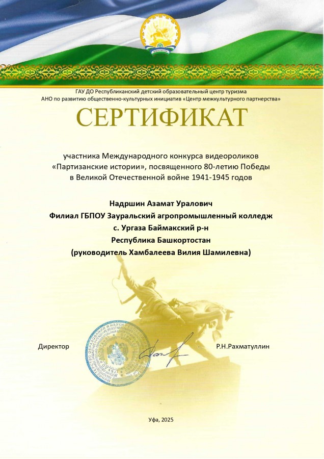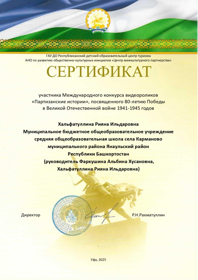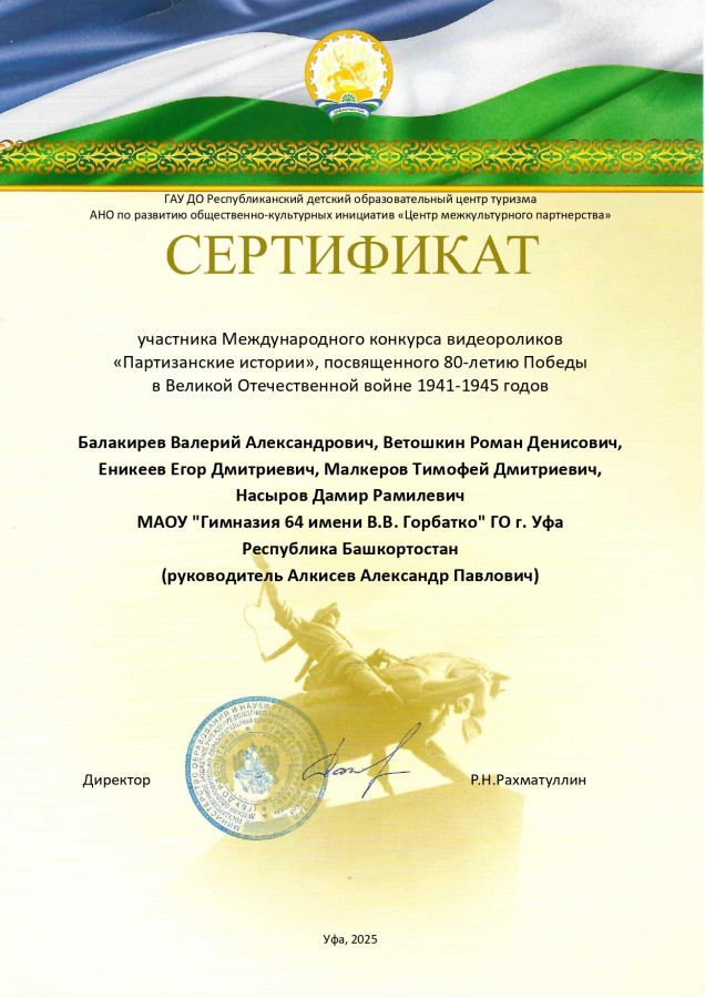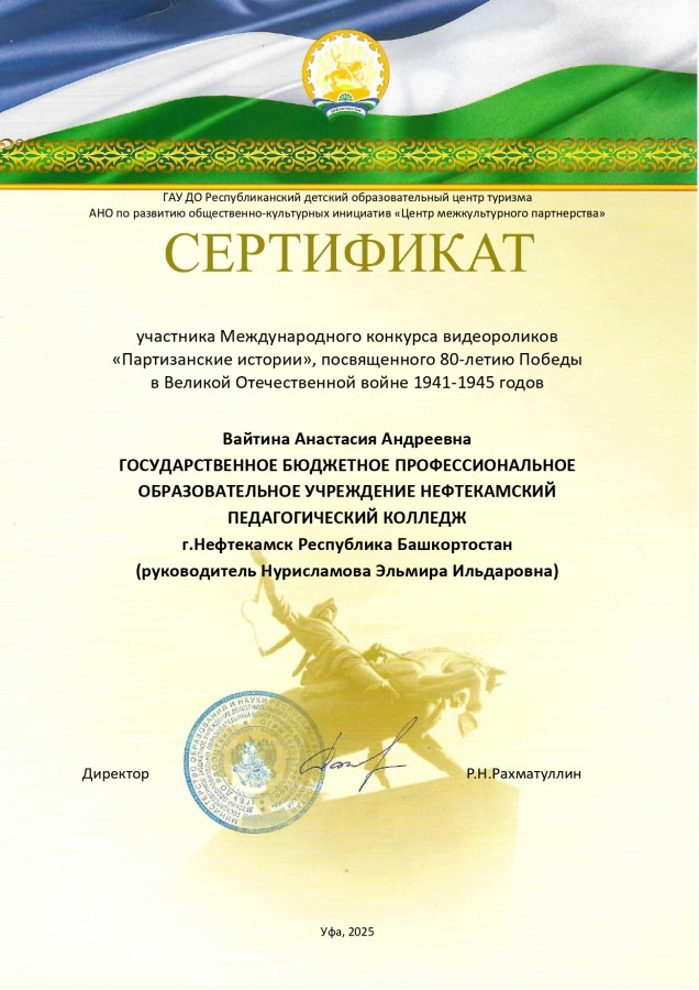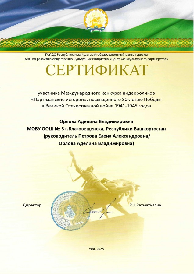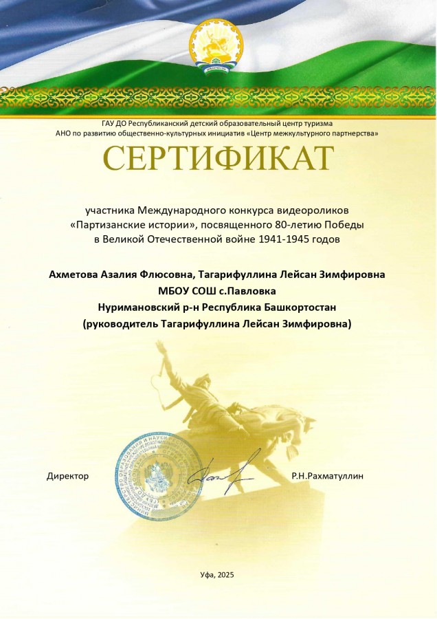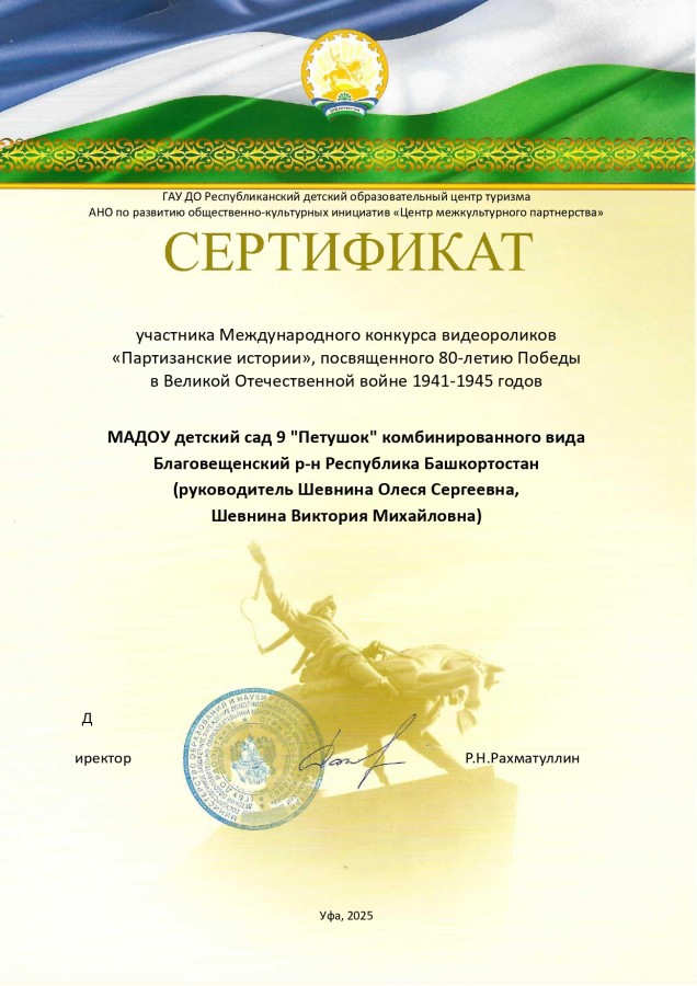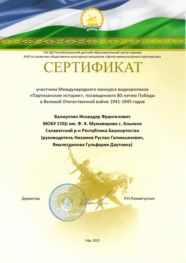 С 20 ноября 2024 года по 10 февраля 2025 года Республиканский детский образовательный центр туризма провёл Международный конкурс видеороликов «Партизанские истории», посвящённый 80-летию Победы в Великой Отечественной войне. Мероприятие прошло в рамках историко-просветительского проекта «Жители Башкирии в рядах партизан и подпольщиков в годы Великой Отечественной войны 1941–1945 гг.», разработанного АНО «Центр межкультурного партнёрства» при поддержке Фонда Главы Республики Башкортостан.