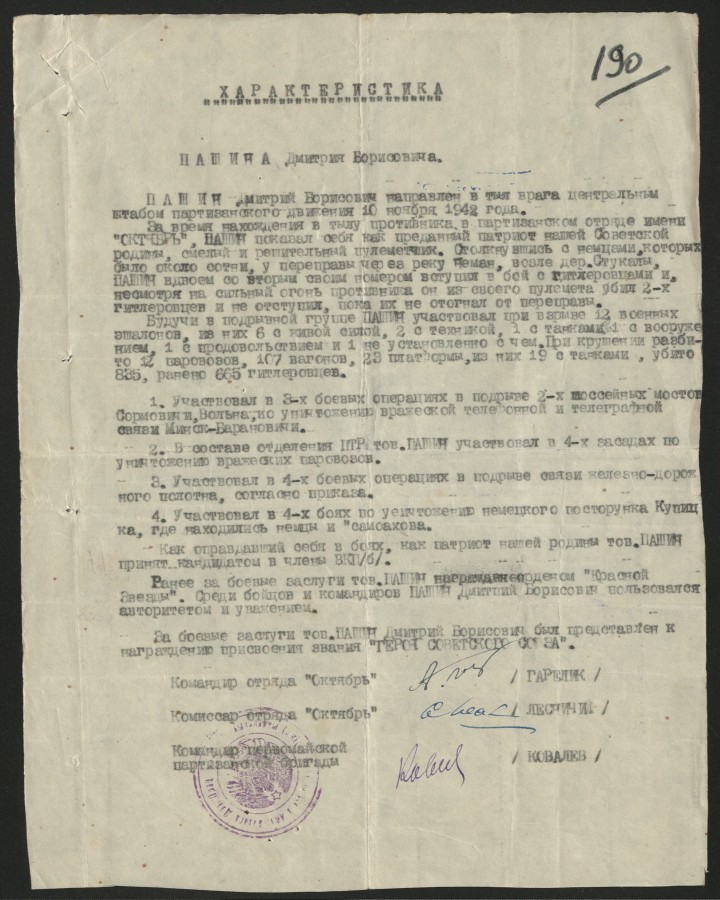 Но главный подвиг ждал его в Белоруссии. В ноябре 1942 года Пашина перебросили за линию фронта, в состав партизанского отряда «Октябрь» Первомайской партизанской бригады. До июля 1944 года он был командиром отделения, проводя дерзкие диверсии против нацистов.