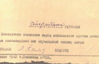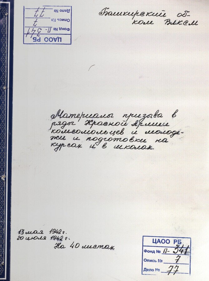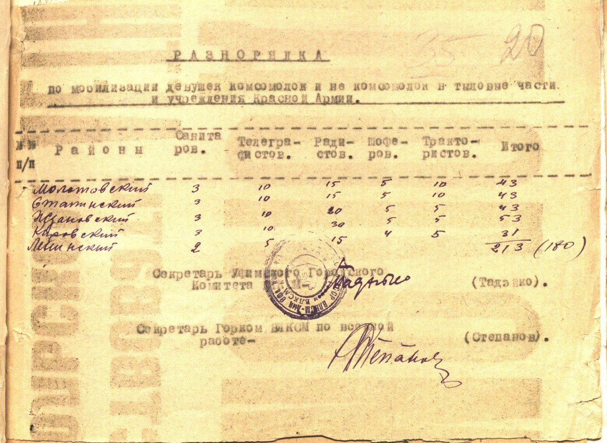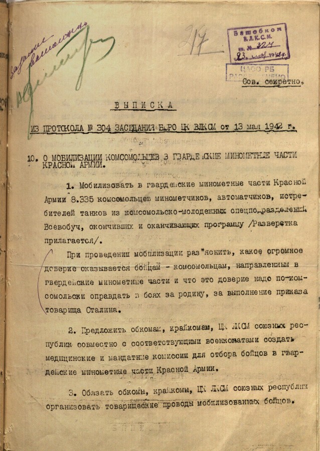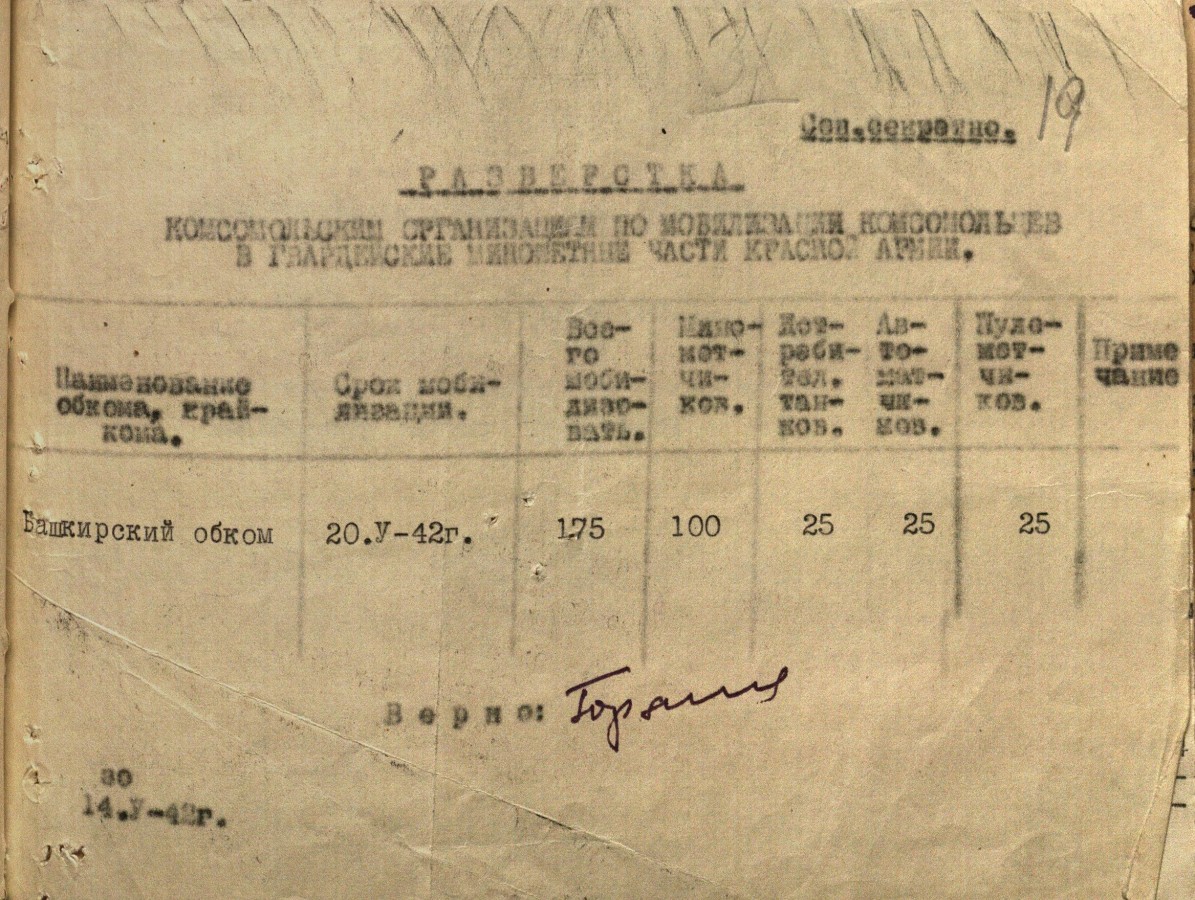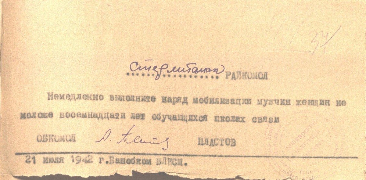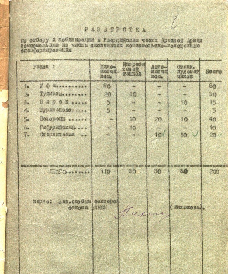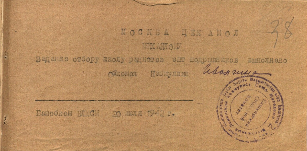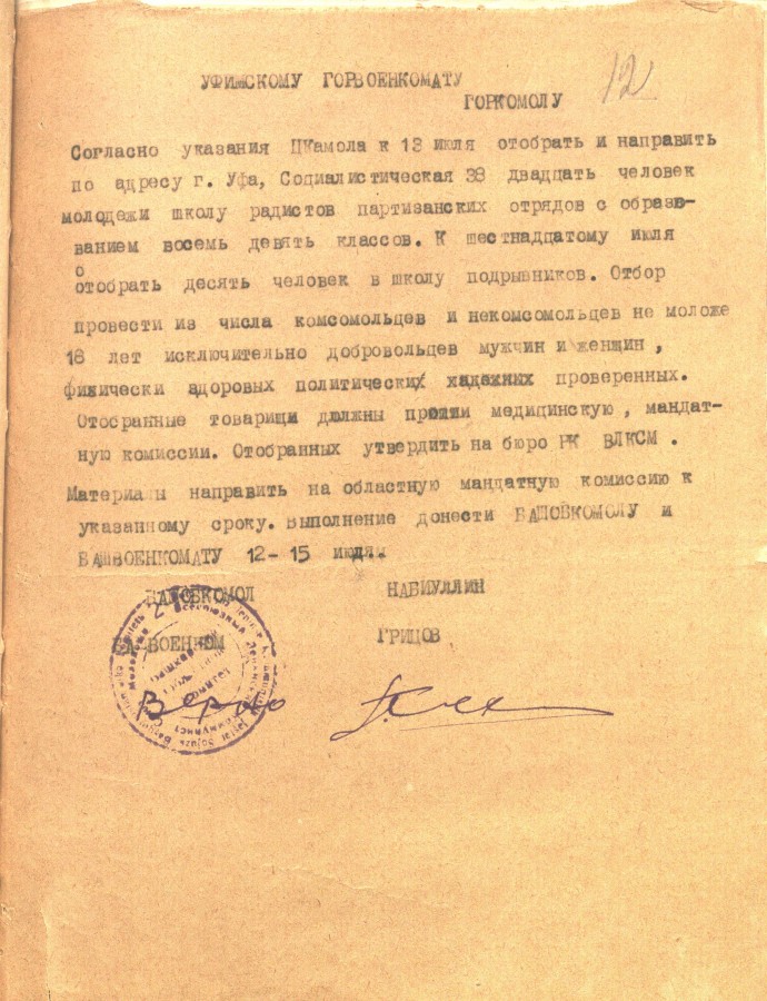 «К 16 июля отобрать 10 человек в школу подрывников. Отбор произвести из числа комсомольцев не моложе 18 лет исключительно добровольцев из мужчин и женщин, физически здоровых политически проверенных. Отобранные товарищи должны пройти медицинскую, мандатную комиссии. Отобранных утвердить на бюро РК ВЛКСМ. Материалы направить на областную мандатную комиссию к указанному сроку. Выполнение донести БАШОБКОМОЛУ и БАШВОЕНКОМАТУ 12-15 июля». Документ приводим максимально приближенным к тексту, чтобы «войти» в лексику и стиль военного времени.