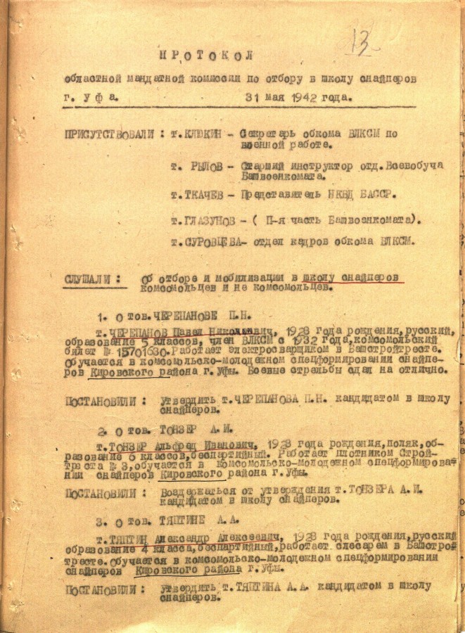 Следующий документ – протокол областной мандатной комиссии по отбору в школу снайперов 31 мая 1842 года (с характеристиками 34 кандидатов). Протокол об утверждении 25 кандидатов курсантами школы снайперов дополняет сведения о выполнении предписаний руководства призывом среди молодежи республики.