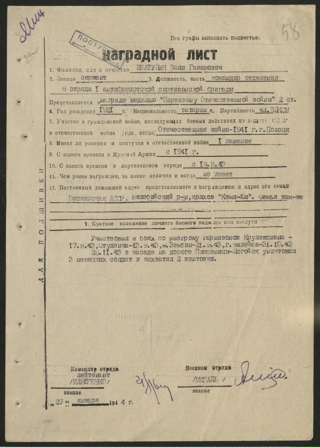 27 января 1944 года командир 6-го партизанского отряда Ильющенко представил Ибатулина Вали Газимовича к медали «Партизану Отечественной войны» II степени — но получить награду герой не успел…