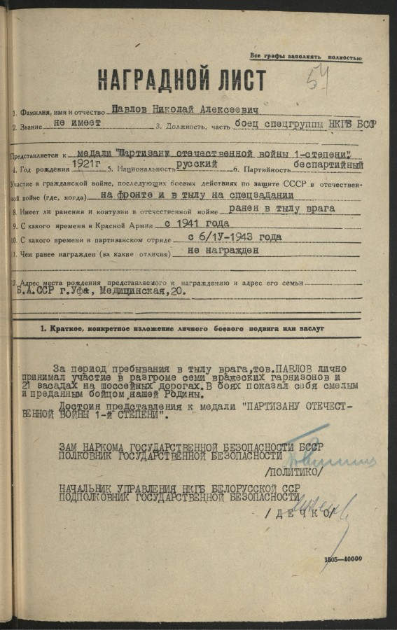 В мультимедийной базе данных Республики Башкортостан “Фронт в тылу врага” есть наградной лист Николая Павлова https://partizany-bassr.ru/partizan/partizan_65.html. Скупые строки этого документа не дают ответа на вопрос о боевом прошлом партизана. В ходе исследовательской работы удалось установить: уроженец Уфы Павлов Николай Алексеевич, 1921 г.р., воевал в диверсионно-разведывательном специальном отряде НКВД “Славный”. Документы спецотряда хранятся в архиве КГБ Республики Беларусь.