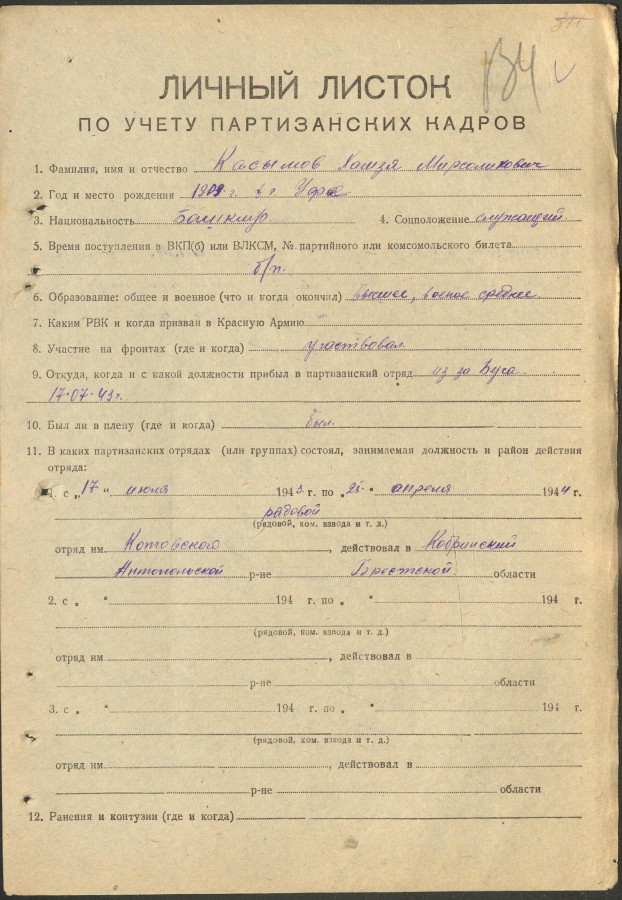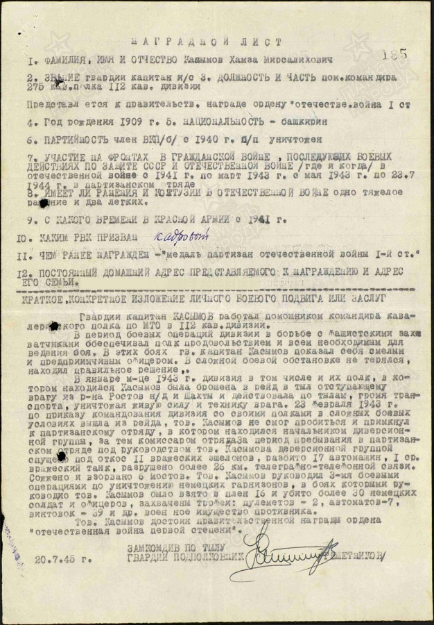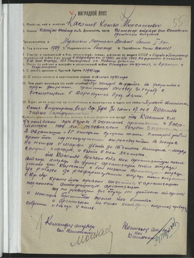 В наградном листе на представление к медали «Партизану Отечественной войны» 1 степени отмечается: «… тов.Касымов проявил себя как организатор после отхода отряда за фронт в организации нового отряда… где был назначен комиссаром отряда, где работал до расформирования отряда после соединения с Красной Армией. Кроме того проявил инициативу в организации под его руководством подпольной антифашистской организации… систематически проводил собрания и беседы в селах».