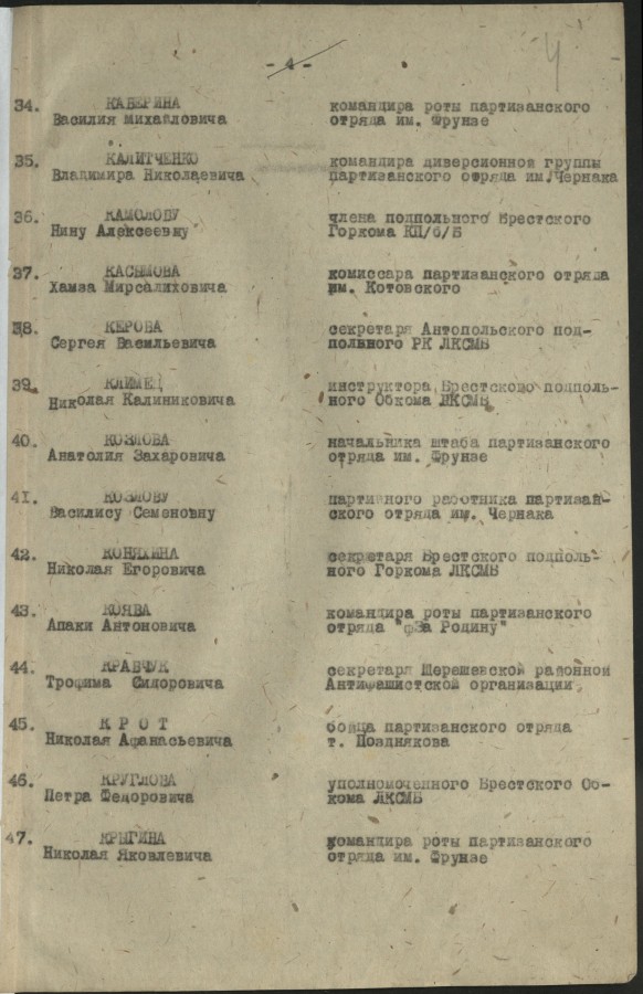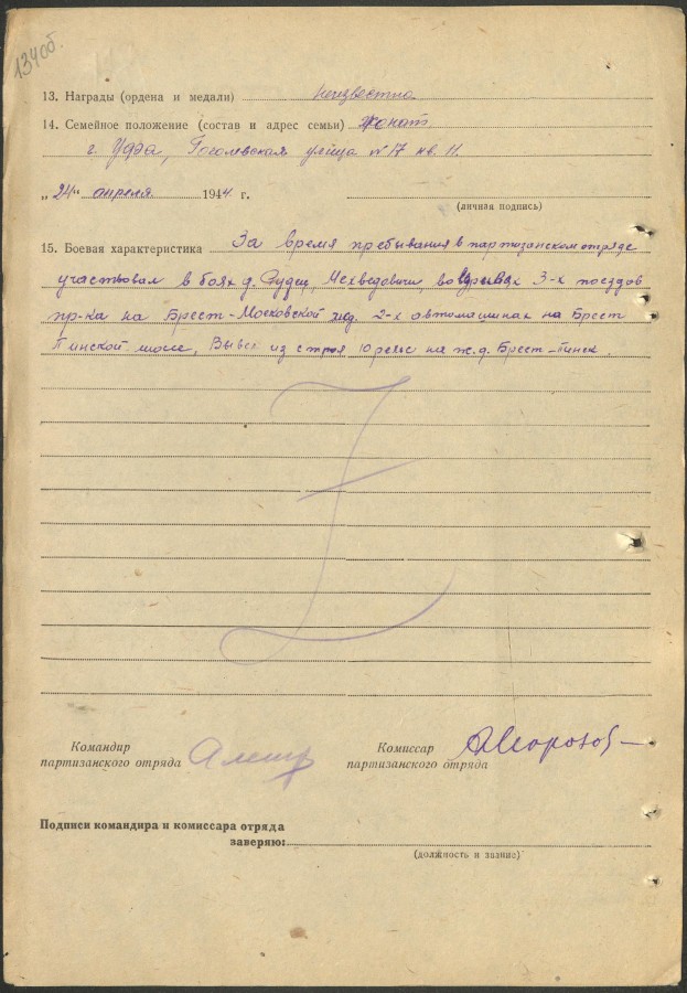 16 июля 1943 г. прибыл в партизанский отряд «из плена, из-за Буга» и был зачислен рядовым бойцом. «За время пребывания в партизанском отряде, - отмечается в личном листке по учету партизанских кадров, принимал участие в боях у д. Рудец, Мехведовичи, в время взрыва 3-х поездов противника на Брест-Московской ж.д., 2-х автомашин на Брест-Пинском шоссе. Вывел из строя 10 рельс на ж.д. Брест-Пинск».