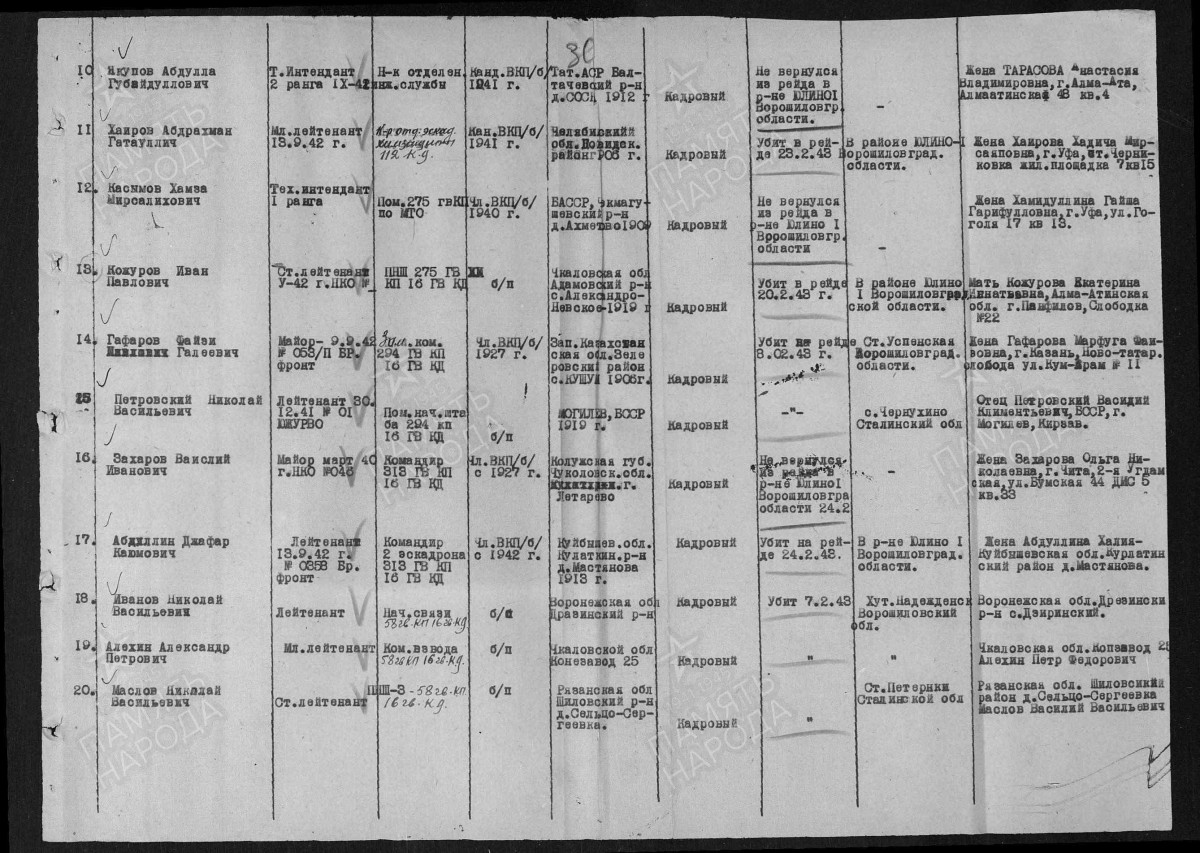 С 1941 г. по февраль 1943 г. на фронте помощник командира 58-го гвардейского (бывший 275-й кавалерийский) полка 7-го гвардейского корпуса 16-й Башкирской гвардейской кавалерийской дивизии (бывшей 112-й Башкирской кавалерийской дивизии). Награжден орденом Красной Звезды. Между 01.01.1943 и 24.02.1943 пропал без вести – не вернулся из рейда. Место выбытия: Украинская ССР, Ворошиловградская обл., Ивановский р-н, в районе Юлино-1. Возможно это случилось 23.02.1943 г. – в день, когда погиб командир дивизии генерал-майор Минигали Шаймуратов?