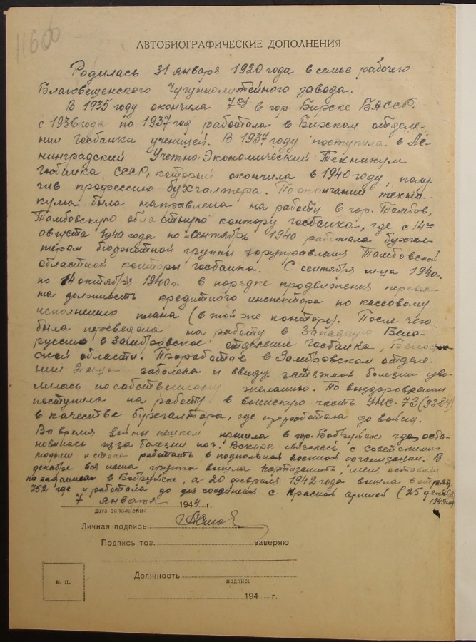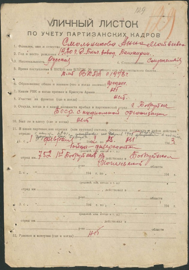Смольникова Анна Матвеевна (русская, 31.01.1920 г.р., с. Благовещенский завод Башкирской АССР). Отец — рабочий чугунолитейного завода, затем сторож Бирской типографии; мать — Ольга Алексеевна, домохозяйка. Семья жила в г. Бирске по ул. Октябрьской революции, д. 5.