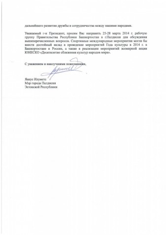На приглашение мэра г.Палдиски Эстонской Республики Яануса Илуметс Министерством культуры Республики Башкортостан были направлены в Правительство Республики Башкортостан предложения о целесообразности направления спортсменов и творческой делегации Республики Башкортостан для участия в праздничных мероприятиях, посвященных 260-летию со дня рождения Салавата Юлаева в г.Палдиски, которые были поддержаны частично.