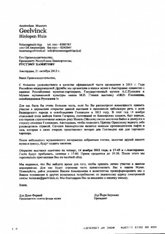 Приглашение Главы Республики Башкортостан на открытие выставки, посвященной 200-летию освобождения Нидерландов русскими войсками от наполеоновского господства «1813 год: Голландия, освобожденная русскими», организованной Генеральным директором Музея Гелвинк в Амстердаме Юрном Буйсманом в рамках перекрестного года Россия – Нидерланды, посвященного 400-летию установления культурных связей между Россией и Нидерландами.