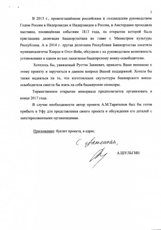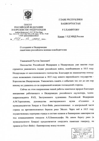 Вопрос о создании на территории Нидерландов памятника российским воинам-освободителям был поднят в письме Посла Российской Федерации в Нидерландах А.В. Шульгина Главе Республики Башкортостан Р.З.Хамитову от 6.07.2016 г. В феврале 2017 г. в адрес Главы РБ поступило письмо заместителя МИД Российской Федерации А.Мешкова с информацией о готовности оказать содействие в реализации проекта по открытию памятника в Нидерландах (от 21.02.2017 г.).