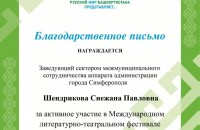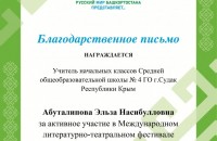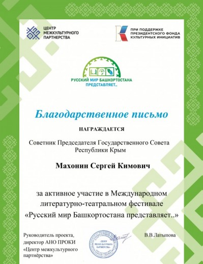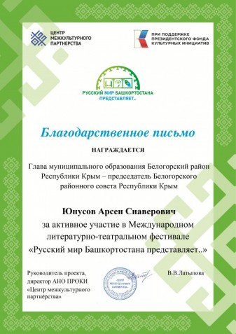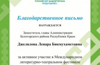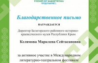 В рамках фестиваля состоялась церемония награждения победителей международного конкурса детских рисунков «Подарок Внучке Оленьке – сказка Аленький цветочек» мотивам сказки С.Т.Аксакова и «Своей семье я говорю: «Спасибо!», в каждом из которых приняло участие более 1000 детей из регионов России и зарубежных стран. Руководитель АНО ПРОКИ «Центр межкультурного партнерства» Валентина Латыпова и заместитель главы администрации Белогорского района Ленара Джелялова поздравили победителей конкурсов из Республики Крым, вручили им подарки и дипломы.
