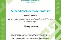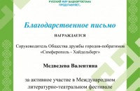 Живой интерес присутствующих вызвала презентация выставок «Русские писатели и художники в Крыму» и «Чехов и Германия», сделанная Хельгард Лерхер (Германия). А.П. Чехова любят в Германии, на театральных сценах часто проходят спектакли по его произведениям: «Чайка», «Дядя Ваня», «Три сестры», «Вишневый сад», создано немецкое общество Чехова, открыт музей "Чеховский салон" в Баденвайлере. В г.Гейдельберг работает любительский театр «Давай! Давай! Театр!», ставящий спектакли по произведениям А.П. Чехова на немецком языке. Об этом на фестивале в мае этого года в Уфе рассказали актеры этого театра в рамках круглого стола «Мир русского театра».