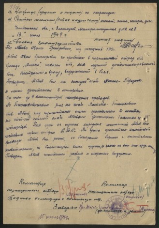 Командир партизанского отряда Маршелков и комиссар Пирогов подписали боевую характеристику, печатью и личной подписью заверил начальник штаба бригады Алексея Пименов. Дата документа – 15 июля 1944 г.