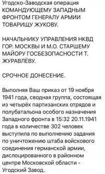 Одним из ярких примеров активного участия сотрудников госбезопасности в обороне Москвы явилась операция по уничтожению штаба 12-го армейского корпуса вермахта, расположившегося в небольшом районном центре Московской области Угодский Завод (родина четырежды Героя Советского Союза Георгия Жукова, ныне – поселок Жуково). И не случайно этой операции посвящены экспонаты, представленные в экспозиции Зала истории внешней разведки, рассказывающей о деятельности чекистов в период Великой Отечественной войны, а также в Центральном историческом музее.