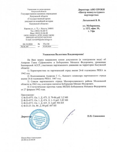 Государственный архив документов новейшей истории Калужской области по запросу Автономной некоммерческой организации по развитию общественно-культурных инициатив «Центр межкультурного партнерства» направил копии документов об Амирове Гаяне Суфияновиче, уроженце Мишкинского района Башкирской АССР и Бобрыкине Михаиле Федоровиче, уроженце г.Уфы – участниках партизанского движения на территории Калужской области: