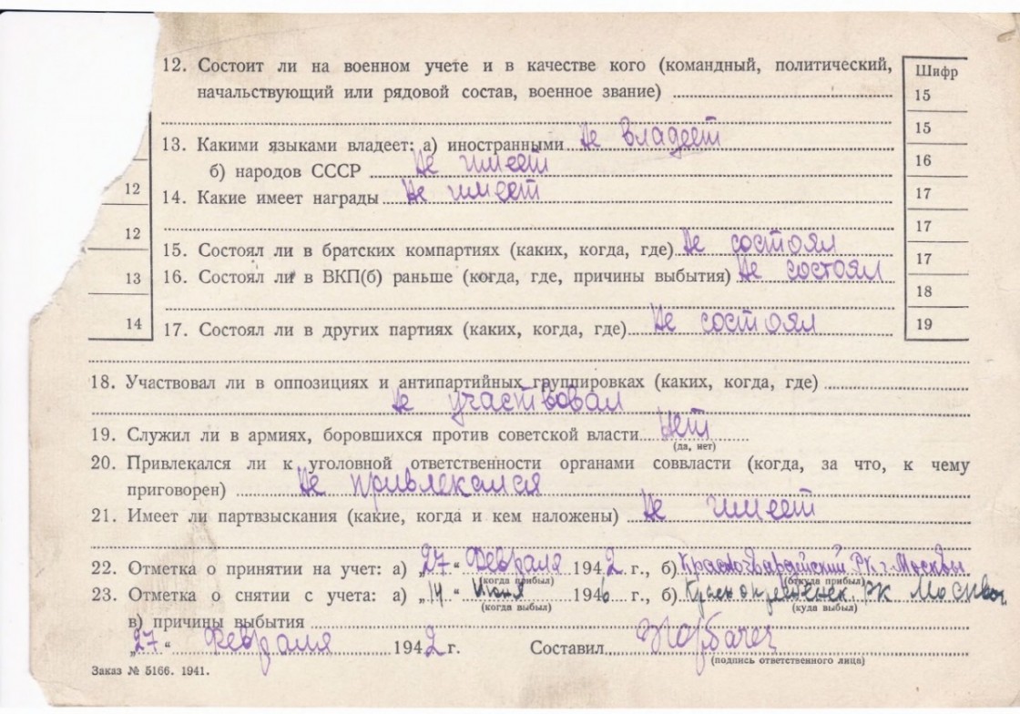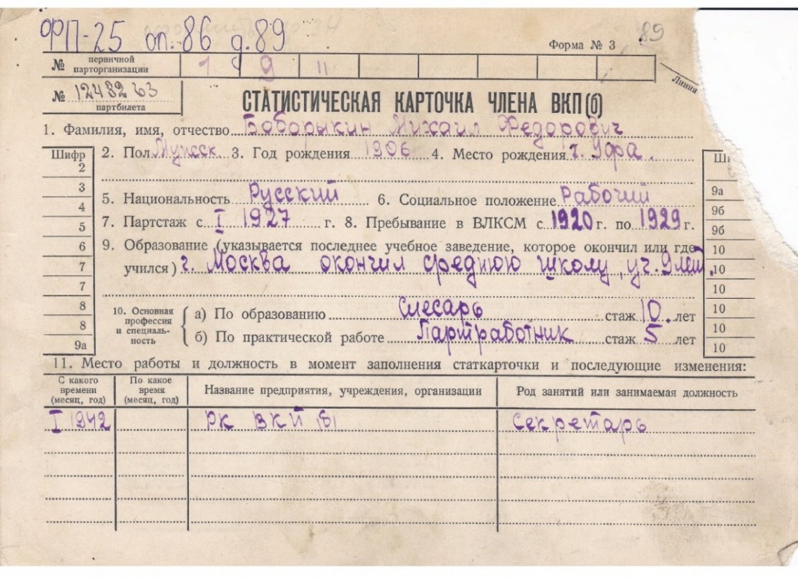 - Статистическая карточка члена ВКП (б) Боборыкина Михаила Федоровича от 27 февраля 1942 года.