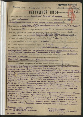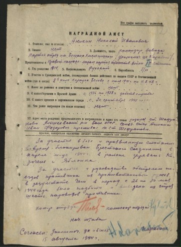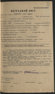 Представлен к Ордену Красного Знамени Белорусским штабом партизанского движения 24.05.1943 года;