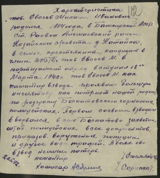 Участвовал в партизанском движении с 27.07.1942 года по 30.07.1944