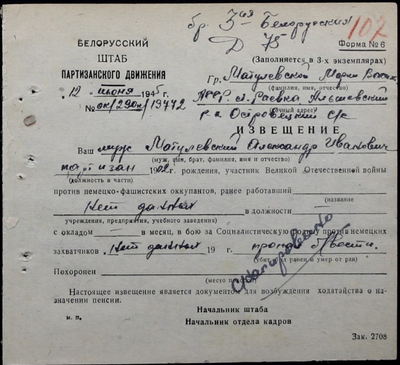 Жена: Матулевская Мария Васильевна, проживала с. Раевка Островецкий сельсовет Альшеевский район
