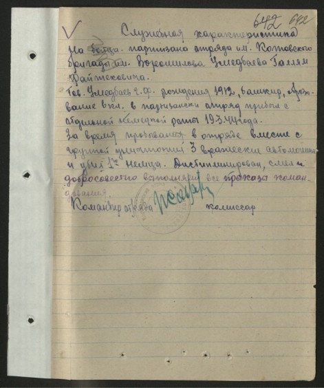 Партизанская бригада «Железняк» и Партизанская бригада им. М.И. Калинина, командир взвода партизанского отряда.