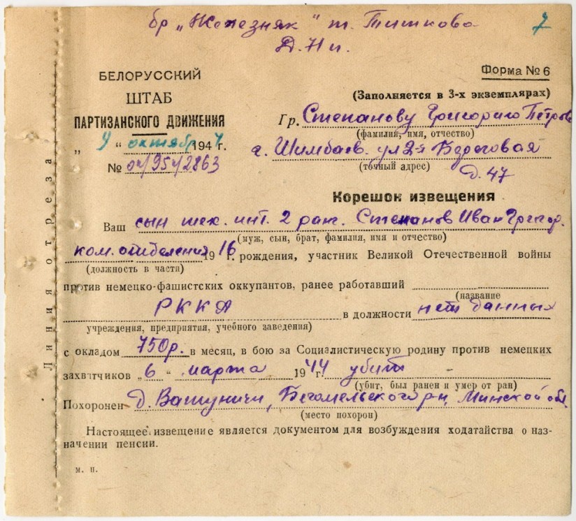 На фотографиях, предоставленных Людмилой Воловиковой, Степанов Иван Григорьевич со своей женой Степановой Евдокией Матвеевной перед отправкой на фронт и фото статьи в общественно-политической газете «Выбор» г. Салавата № 10 от 28 ноября 2014 года «Вспомним всех поименно» о героическом земляке Иване Григорьевичу Степанове. Также приложена фотокопии извещения о гибели Степанова Ивана Григорьевича, направленная отцу бойца Степанову Григорию Петровичу, проживавшему по адресу: г.Ишимбай, ул.2-я Береговая, дом 47. Информация из Базы данных «Партизаны Беларуси».