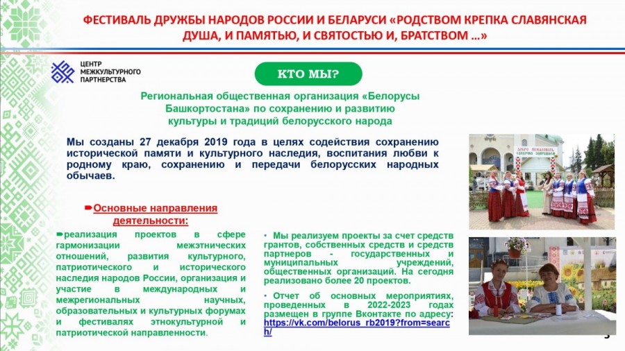 Автономная некоммерческая организация по развитию общественно-культурных инициатив «Центр межкультурного партнёрства» совместно с Региональной общественной организацией «Белорусов Башкортостана» по сохранению и развитию культуры и традиций белорусского народа принимают участие в конкурсе Президентского фонда культурных инициатив на получение гранта на реализацию проекта «Фестиваль дружбы народов России и Беларуси «Родством крепка славянская душа, и памятью, и святостью, и братством...».