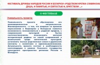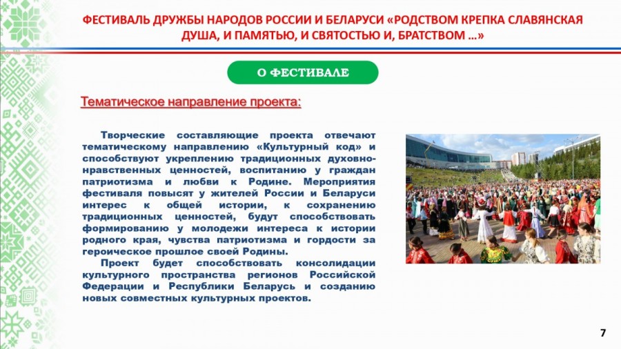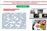 Фестиваль дружбы народов России и Беларуси «Родством крепка славянская душа, и памятью, и святостью, и братством...» является логическим продолжением Международного молодежного культурно-образовательного этнофорума «Славянский хоровод».