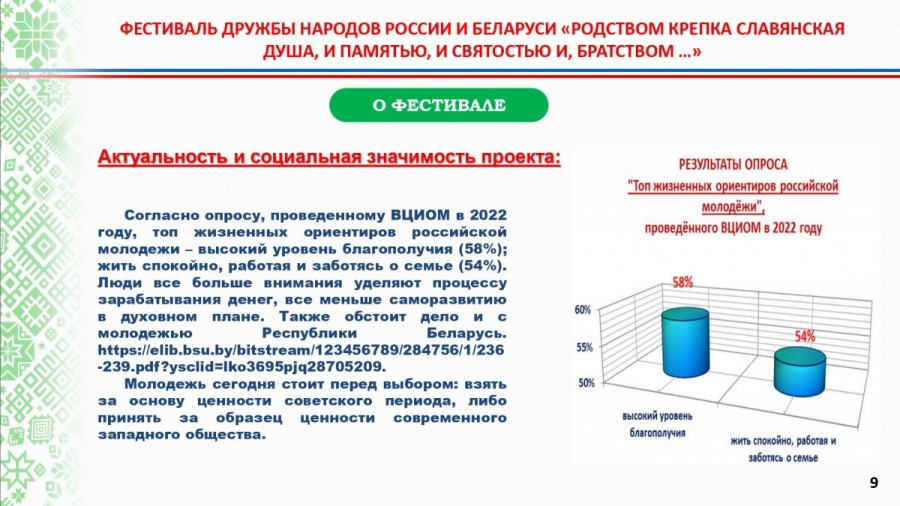 Проект предполагает формирование у молодежи интереса к традиционной культуре и потребности в сохранении историко-культурного наследия славянских народов в противовес феномену «культуры отмены», насаждающемуся Западом.