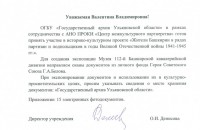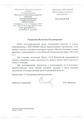 Государственный архив Ульяновской области выразил готовность принять участие в названном проекте и направил для создания экспозиции в Музее 112=й Башкирской кавалерийской дивизии сканы документов из личного фонда Григория Андреевича Белова - Героя Советского Союза, командира 16-й гвардейской Черниговской кавалерийской дивизии.