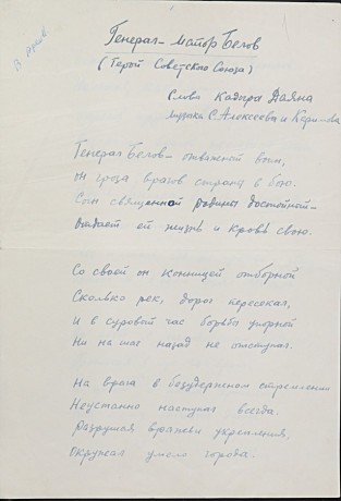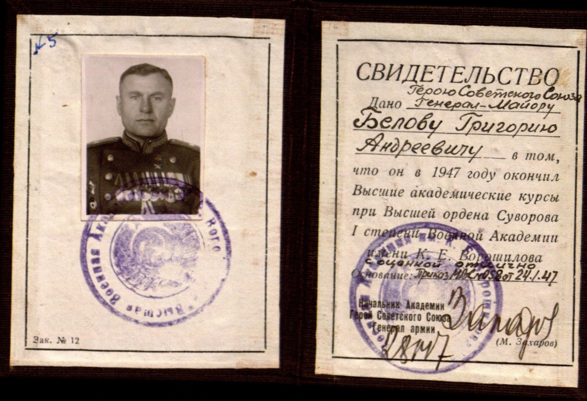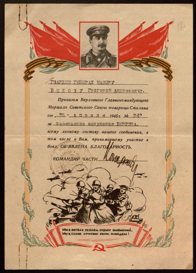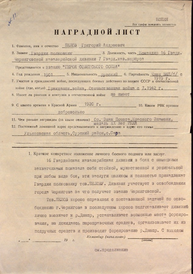 Приложение: Сканкопии письма Государственного архива Ульяновской области и документов из личного фонда Григория Андреевича Белова - Героя Советского Союза, командира 16-й гвардейской Черниговской кавалерийской дивизии.
