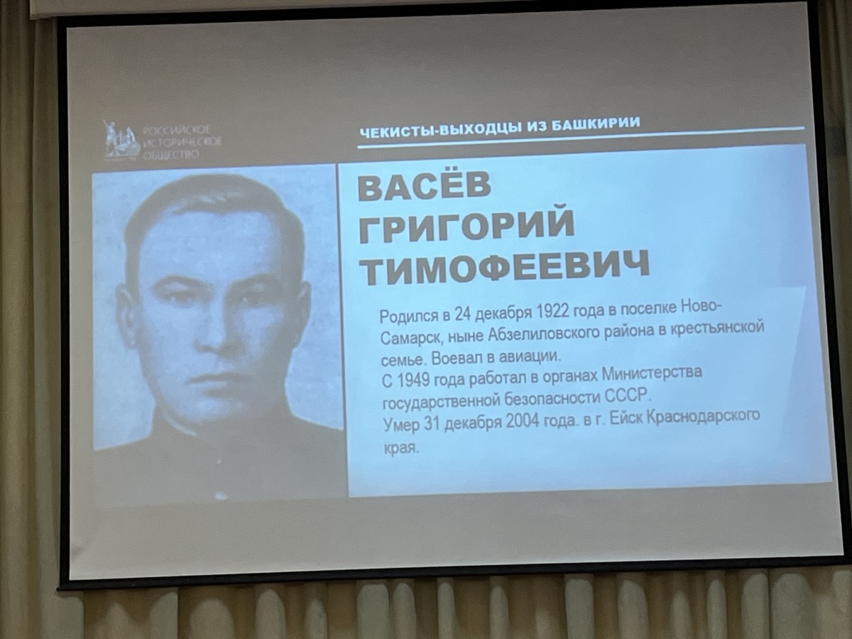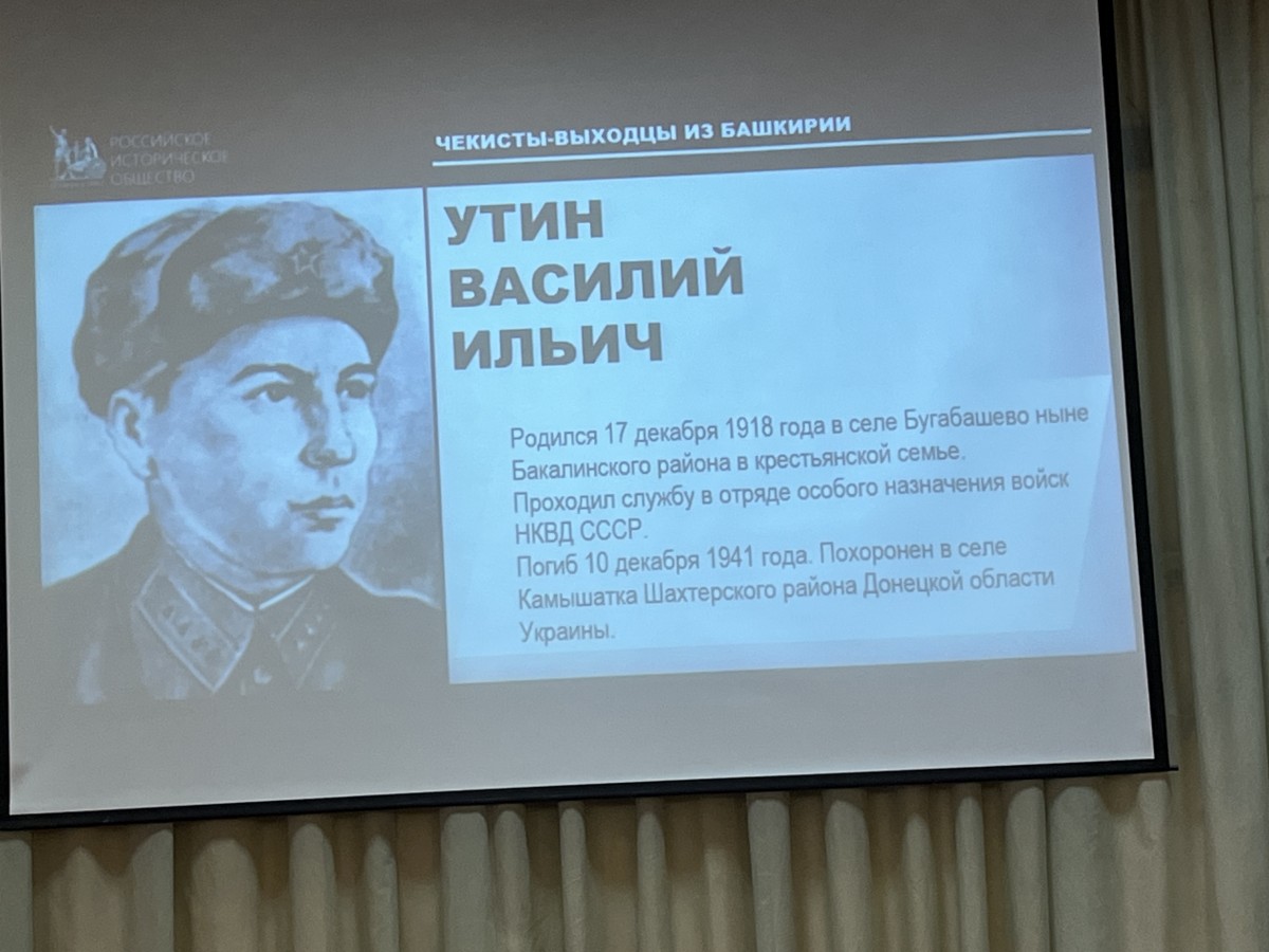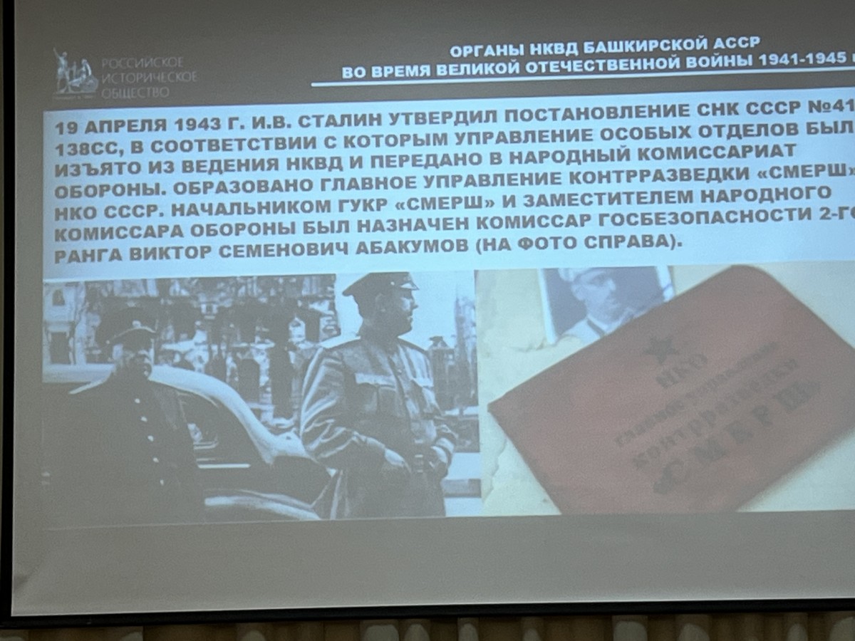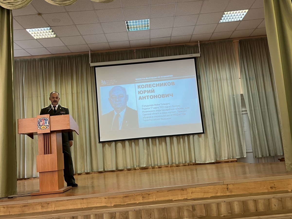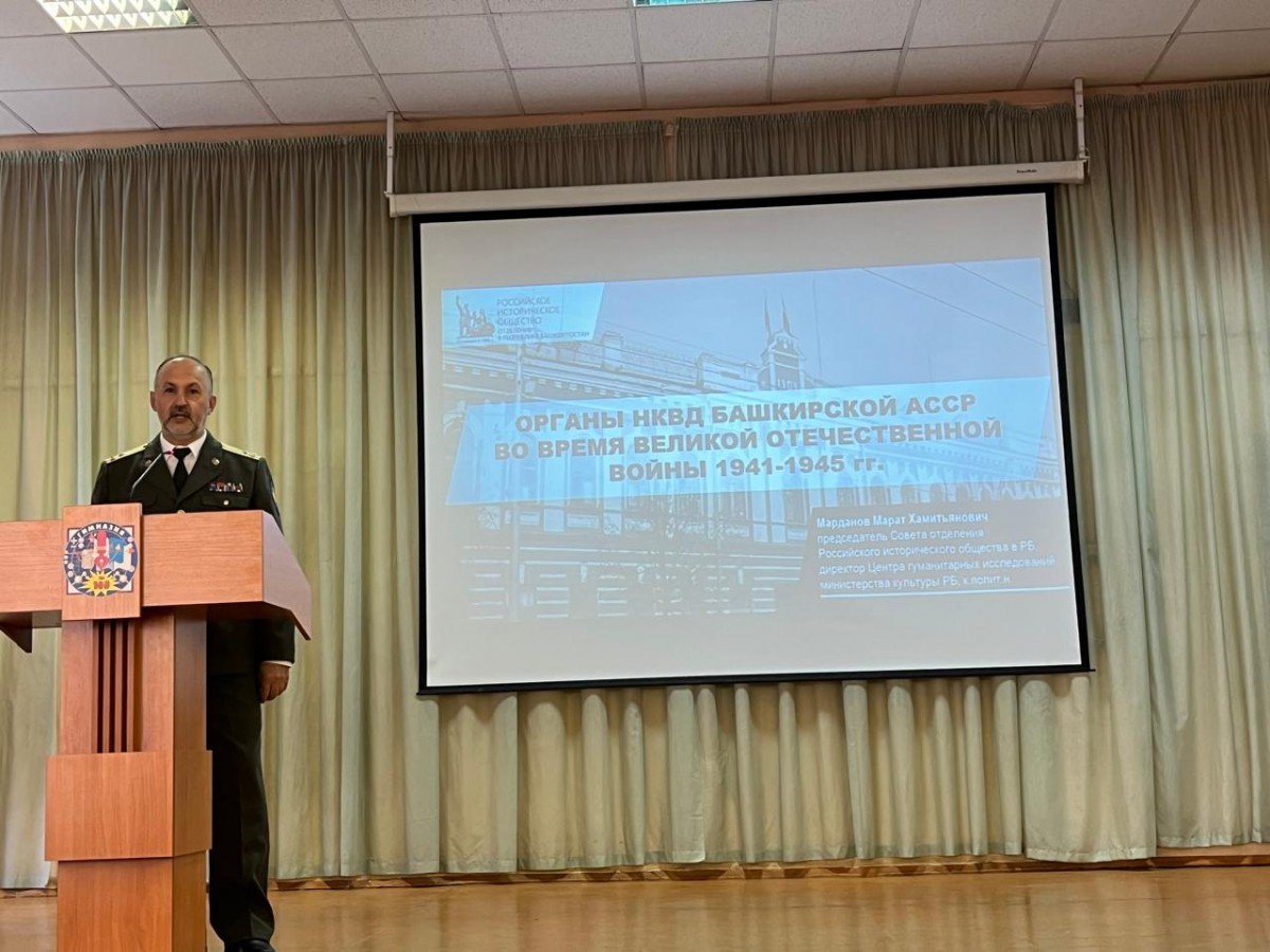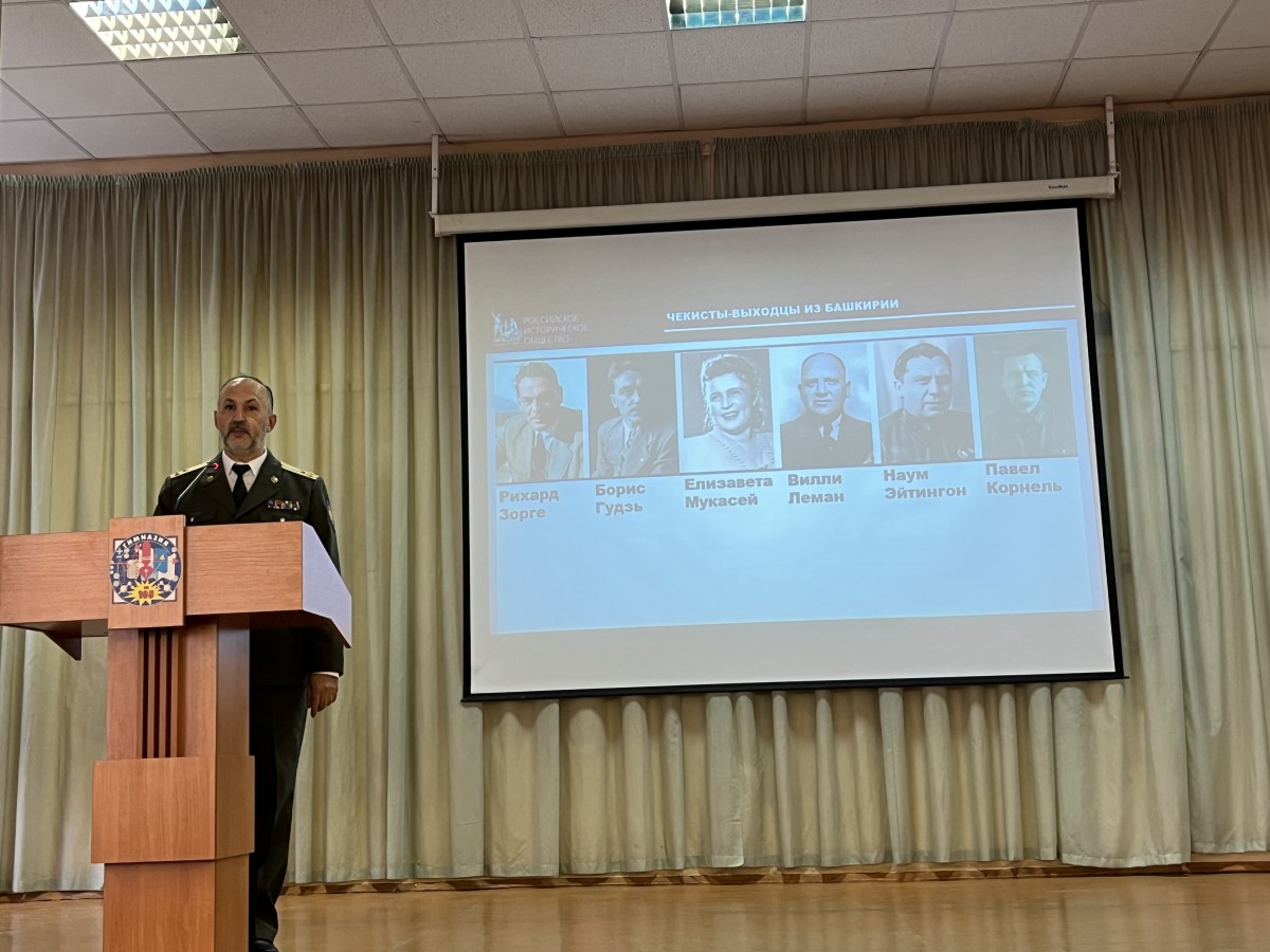 Председатель Совета отделения Российского исторического общества в Республике Башкортостан, директор Центра гуманитарных исследований Министерства культуры Республики Башкортостан, кандидат политических наук, полковник ФСБ в отставке - Марданов М.Х. рассказал ребятам о работе органов государственной безопасности в годы Великой Отечественной войны 1941-1945 гг. и о борьбе с бандитскими националистическими формированиями в послевоенное время.