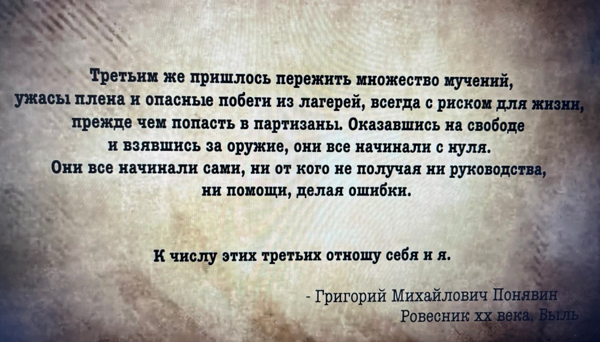 Герой видеоролика Понявин Григорий Михайлович – уроженец д. Береговка Мелеузовского района Башкирская АССР, командир партизанской бригады «Комсомолец», отличившийся особым мужеством, самоотверженностью и храбростью, был награждён орденами Боевого Красного Знамени, Отечественной войны I степени, Красной Звезды и многими медалями. После войны - персональный пенсионер местного значения. Жил в п.Красное Молодечненского района Минской области Республики Беларусь. Умер Григорий Михайлович в 2009 г. и похоронен в п. Красное Молодечненский р-н. Вдова передала награды в Минский областной краеведческий музей Республики Беларусь.