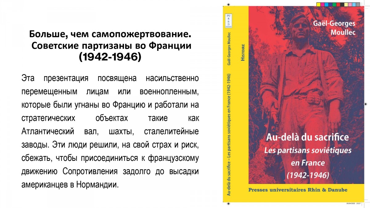 На странице «Новости» Базы данных «Фронт в тылу врага» размещена Презентация «Советские партизаны во Франции (1942-1946)» к выступлению на Межрегиональной научно-практической конференции «ШЛА ВОЙНА НАРОДНАЯ…» профессора, ассоциированного исследователя Центра по изучению экономики, общества, искусства и техники (CRESAT) университета «Верхний Альзас» (г. Милуза, Франция) Муллека Гаэля-Жоржа 14 апреля 2025 года, г.Уфа