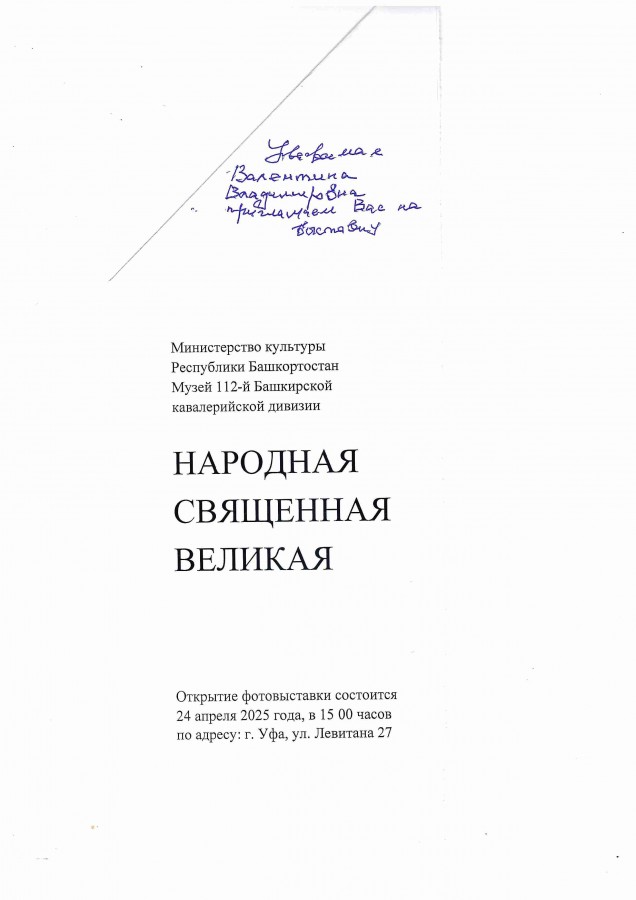 24 апреля 2025 года в Музее 112-й Башкирской (16-й гвардейской) кавалерийской дивизии состоялось торжественное открытие фотовыставки «Народная. Священная. Великая», посвященной 80-летию Победы в Великой Отечественной войне.