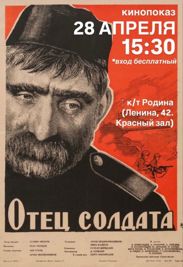 28 апреля 2025 года в кинотеатре «Родина» (г. Уфа) состоялось значимое культурное событие – специальный показ реставрированной колоризованной версии легендарного фильма «Отец солдата» (1964, реж. Резо Чхеидзе). Мероприятие, организованное Грузинским национально-культурным центром им. Шота Руставели в Республике Башкортостан, было приурочено к 80-летию Великой Победы и направлено на укрепление межнационального единства.