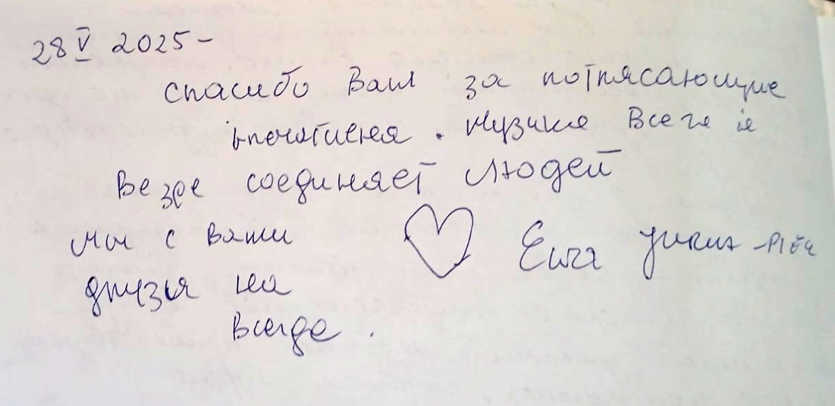 Прощаясь, Ева сделала запись в Книге отзывов и пообещала, что и в следующий приезд в наш город, она непременно придёт в Музей музыки им. Ф.И.Шаляпина и постарается подарить музею что-нибудь интересное.