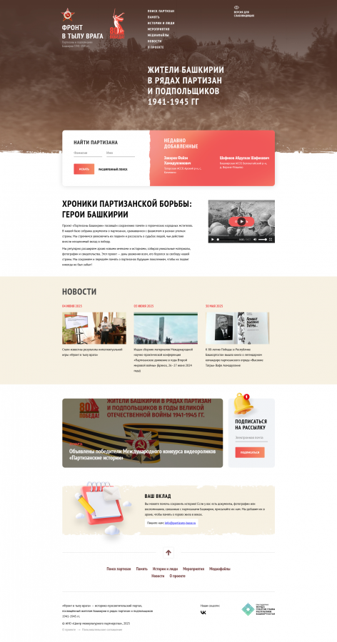 - Выявлено более 1500 историй бойцов-партизан и подпольщиков из Башкортостана, 330 из них внесены в созданную мультимедийную базу данных «Фронт в тылу врага», включающую сведения о героях тех времен, доступную по адресу: https://partizany-bassr.ru./