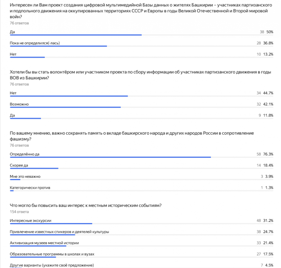 - Подавляющее большинство респондентов (около 90%) выразили интерес к проекту создания цифровой мультимедийной базы данных о жителях Башкирии – участниках партизанского движения.