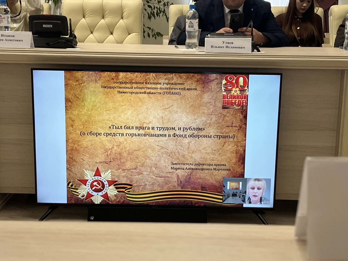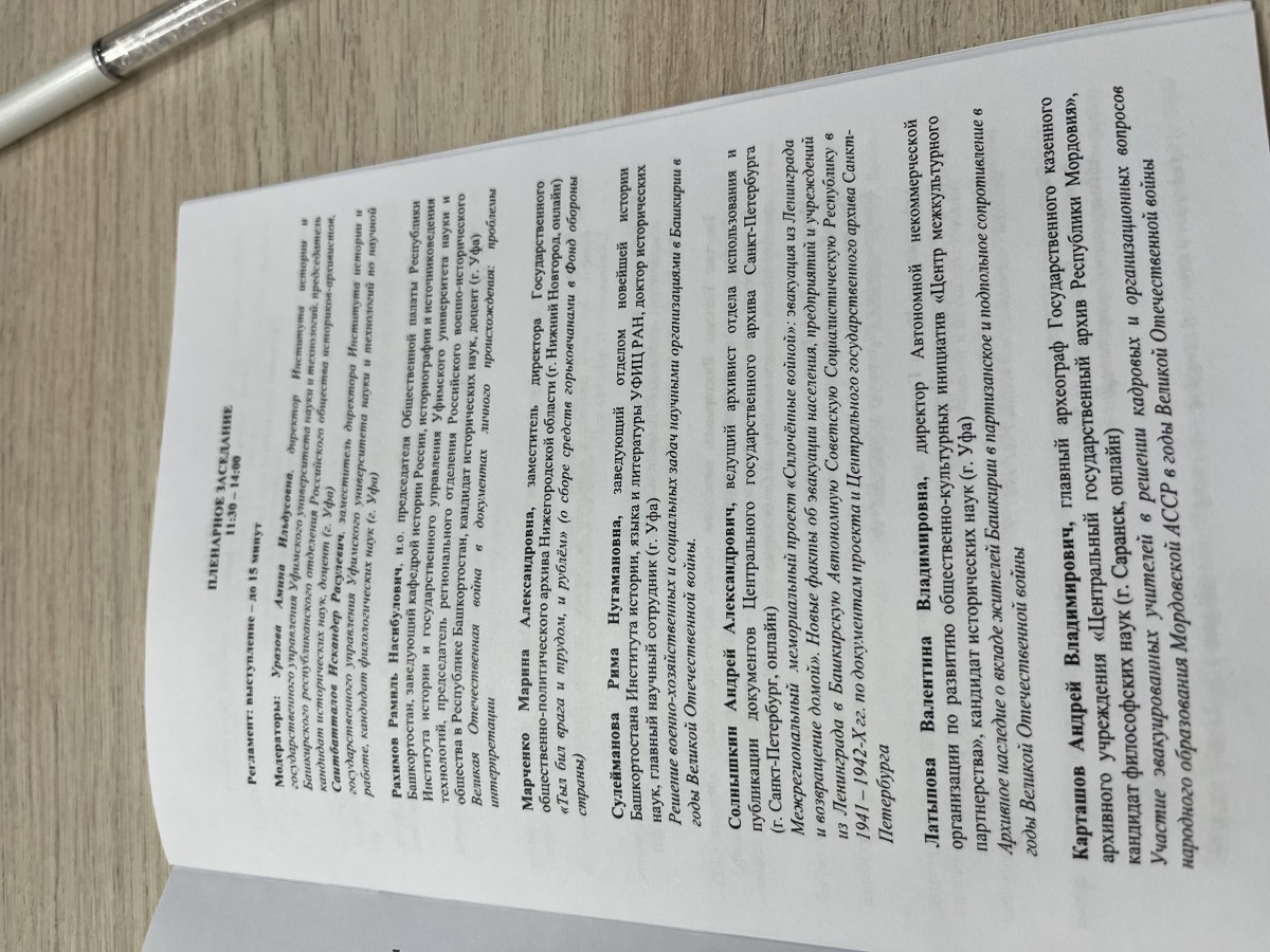 «Тыл бил врага и трудом, и рублём» (о сборе средств горьковчанами в Фонд обороны страны), Рима Сулейманова, заведующий отделом новейшей истории Башкортостана Института истории языка и литературы УФИЦ РАН, доктор исторических наук, главный научный сотрудник с докладом "Решение военно-хозяйственных и социальных задач научными организациями в Башкирии в годы Великой Отечественной войны", Андрей Солнышкин, ведущий архивист отдела использования и публикации документов Центрального государственного архива Санкт-Петербурга с докладом "Межрегиональный мемориальный проект «Сплочённые войной»: эвакуация из Ленинграда и возвращение домой». Новые факты об эвакуации населения, предприятий и учреждений из Ленинграда в Башкирскую Автономную Советскую Социалистическую Республику в 1941 – 1942-Х гг. по документам проекта и Центрального государственного архива Санкт-Петербурга", Андрей Карташов, главный археограф Государственного казенного архивного учреждения «Центральный государственный архив Республики Мордовия», кандидат философских наук "Участие эвакуированных учителей в решении кадровых и организационных вопросов народного образования Мордовской АССР в годы Великой Отечественной войны" и Валентина Латыпова, директор Автономной некоммерческой организации по развитию общественно-культурных инициатив «Центр межкультурного партнерства», кандидат исторических наук с докладом "Архивное наследие о вкладе жителей Башкирии в партизанское и подпольное сопротивление в годы Великой Отечественной войны".