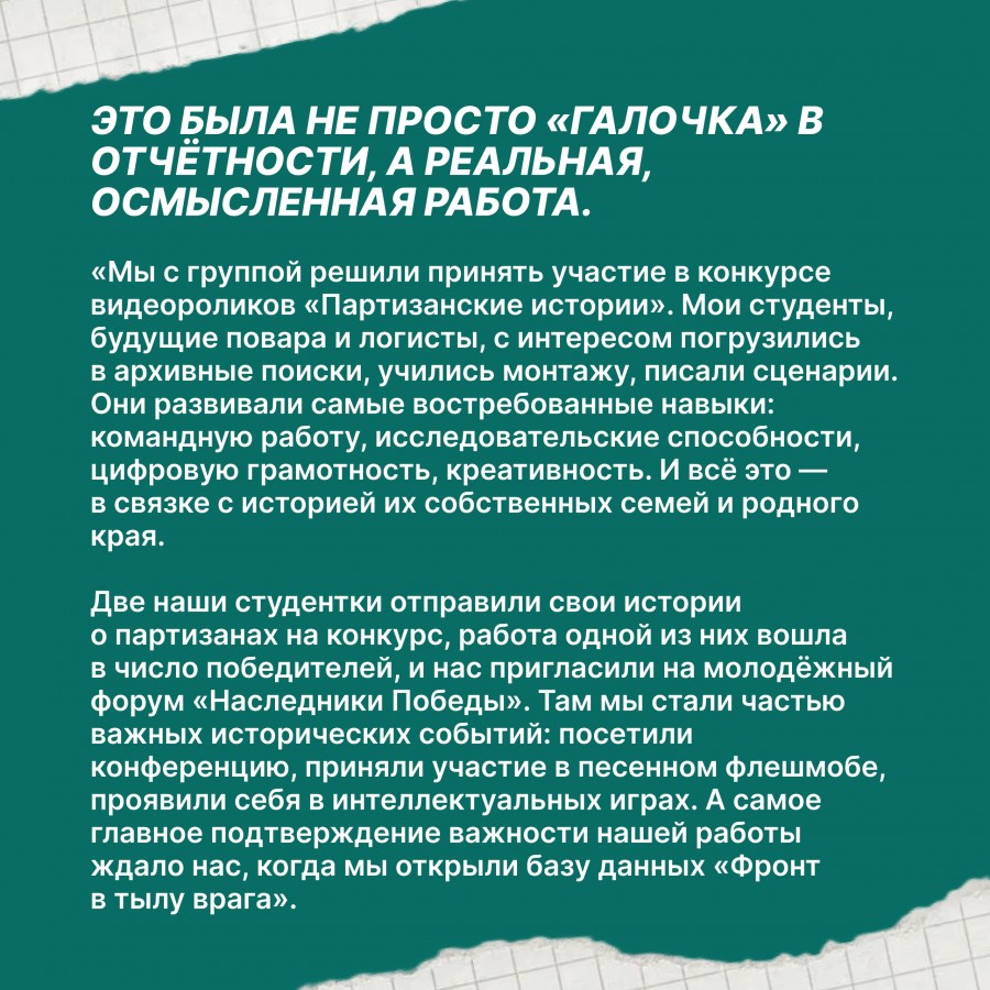 Сегодня в нашей рубрике преподаватель информатики Ольга Пищаева. Она честно рассказывает о том, как проект «Историко-просветительский проект: Жители Башкирии в рядах партизан и подпольщиков в годы Великой Отечественной войны» помог ей и студентам её группы понять, что история ближе, чем кажется.
