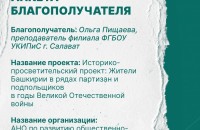 Отзыв участника Историко-просветительского проекта «Жители Башкирии в рядах партизан и подпольщиков в годы Великой Отечественной войны» преподавателя филиала ФГБОУ УКИПиС г.Салават Ольги Пищаевой о проекте.