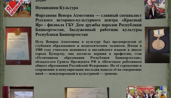 Центр межкультурного партнерства представил на престижный Всероссийский конкурс «Женщина – мать нации» достойного кандидата в номинации «Культура» — Венеру Ахметовну Фарганову, заслуженного работника культуры Республики Башкортостан и главного специалиста Русского историко-культурного центра «Красный Яр».