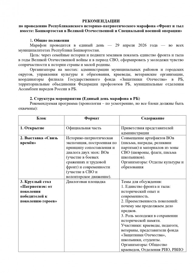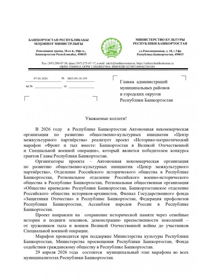 Министерство культуры Республики Башкортостан направило официальное обращение главам администраций муниципальных районов и городских округов с просьбой оказать содействие в организации и проведении Республиканского историко-патриотического марафона «Фронт и тыл вместе: Башкортостан в Великой Отечественной и Специальной военной операции».
